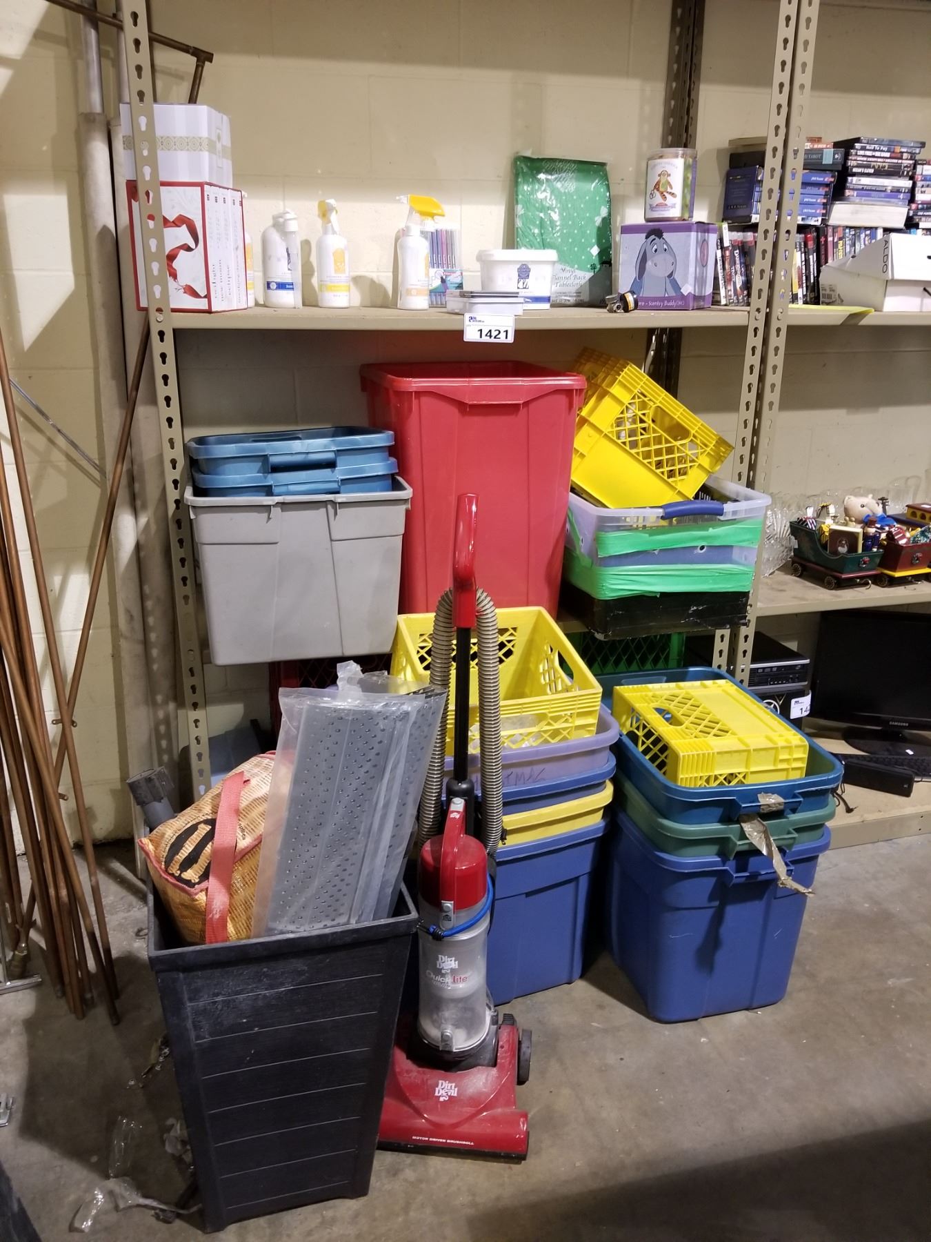3 SHELVES OF ASSORTED BINS, DIRT DIRT DEVIL VACUUM, CLEANERS & MORE