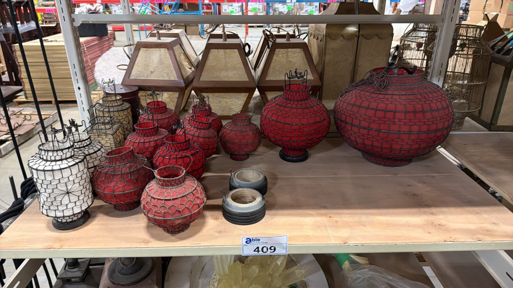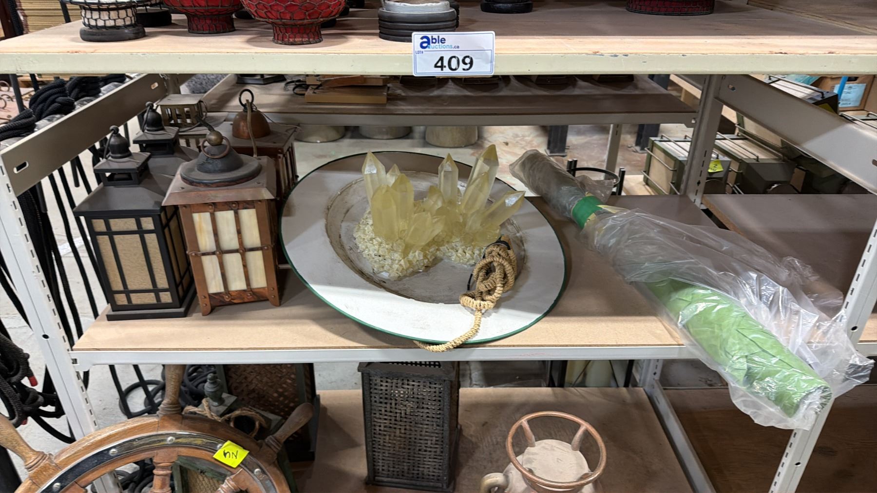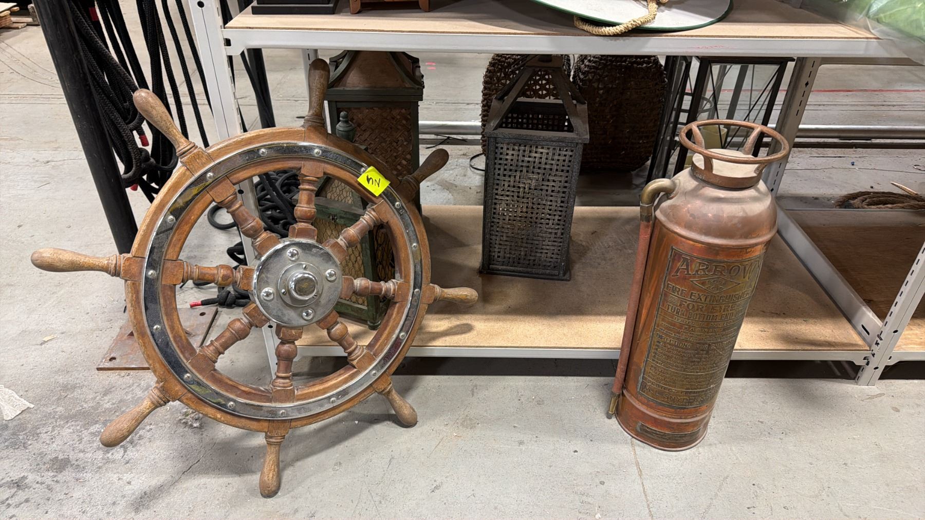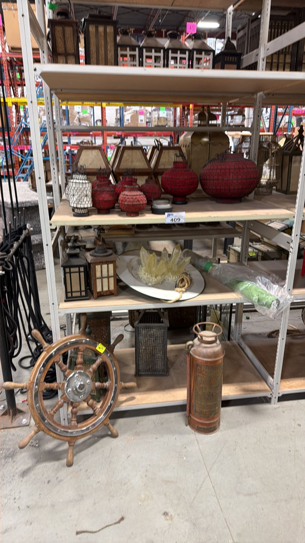 3 SHELVES OF ASSORTED LANTERNS, CAPTAINS WHEEL, VINTAGE FIRE EXTINGUISHER, FAUX CRYSTALS & MORE