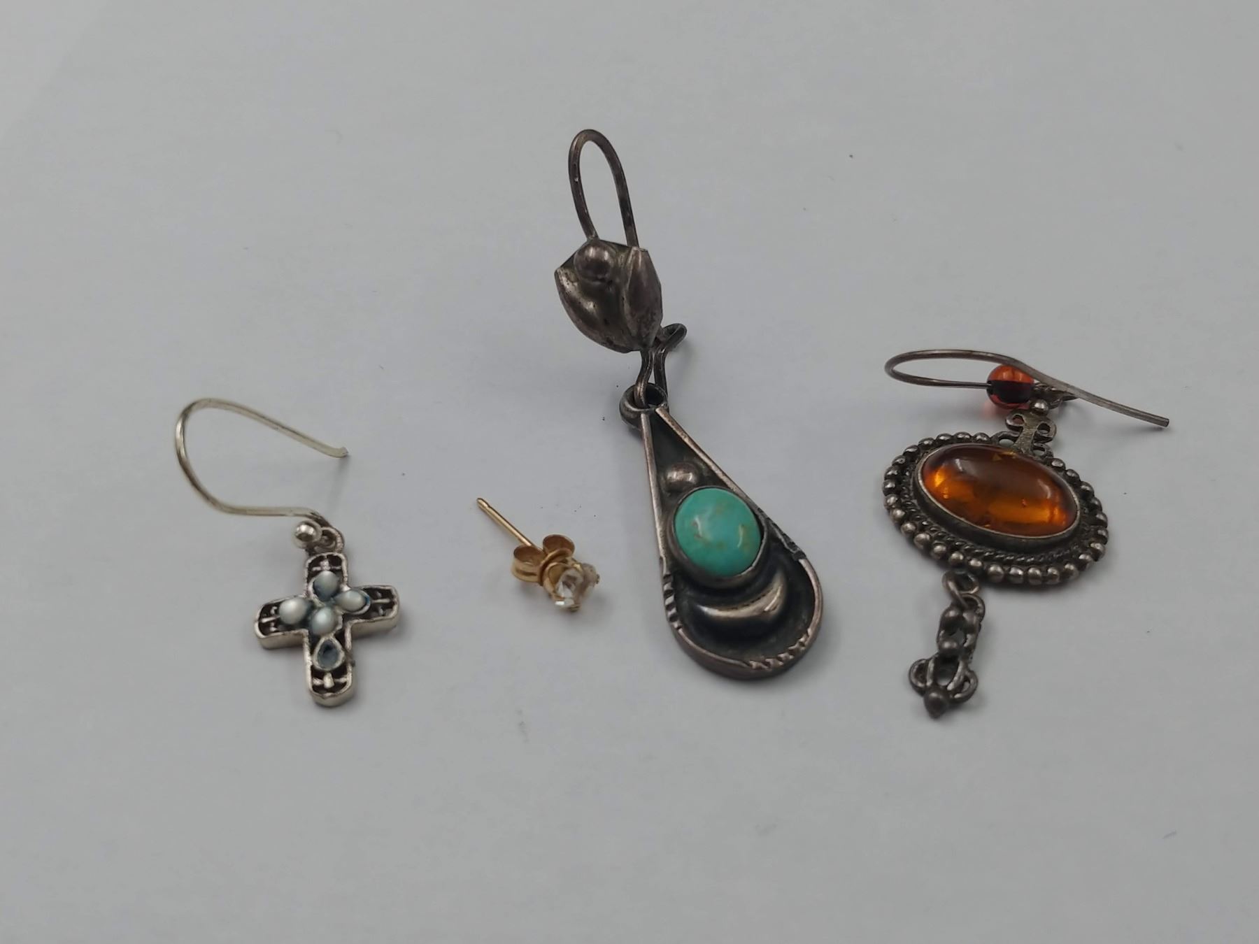 3 SINGLE SILVER EARRINGS AND SINGLE GOLD EARRING