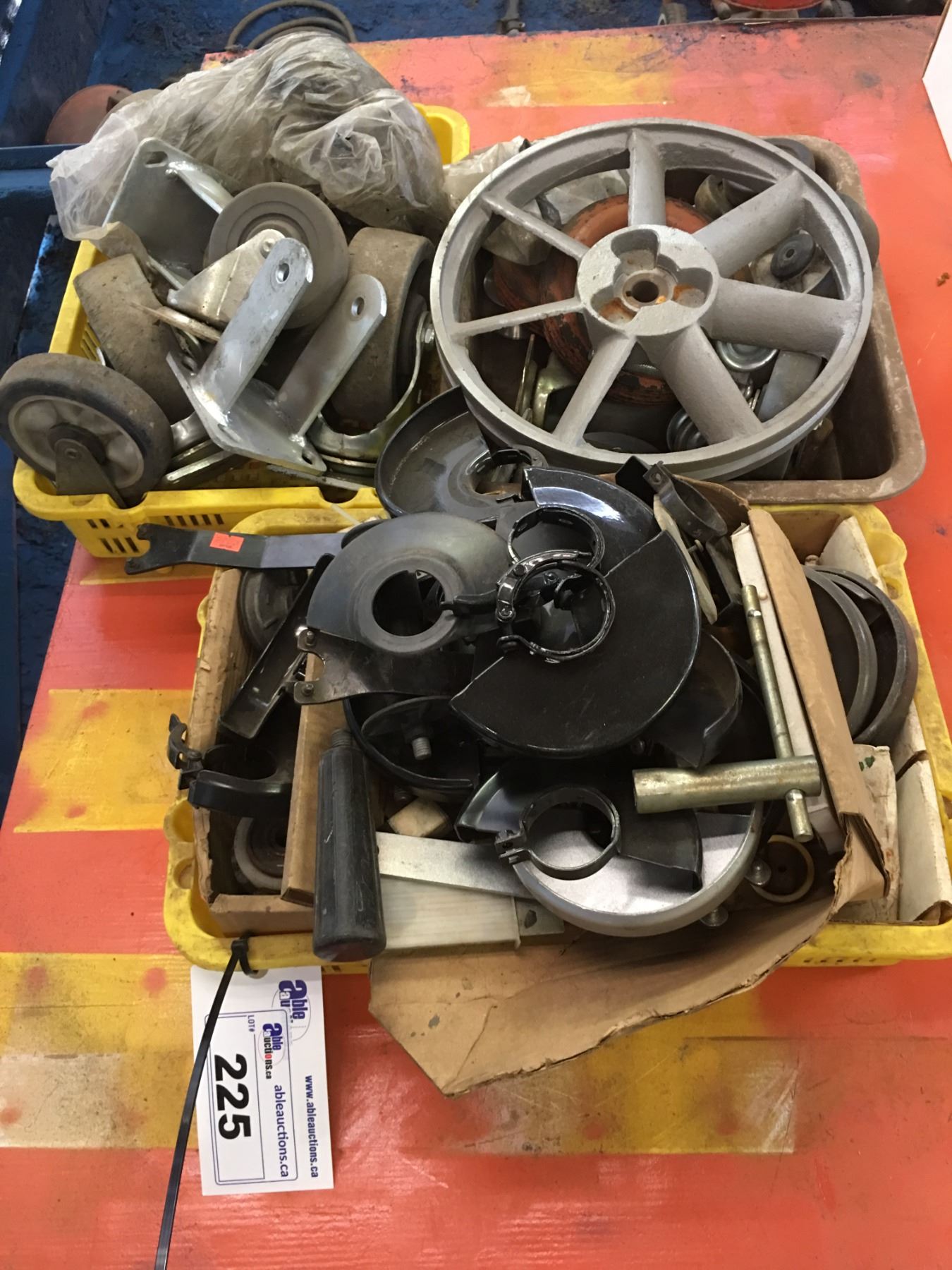 3 SMALL YELLOW BINS OF ASSTD CASTORS, GRINDER, SHIELDS & MISC. ITEMS