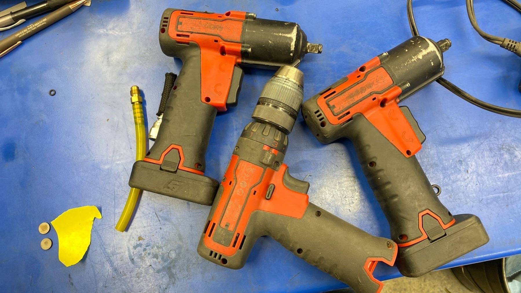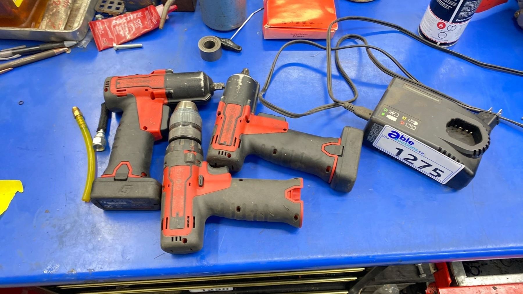 3 SNAP-ON L-ION GUNS. 2X 3/8 IMPACT AND 14.4V DRILL WITH CHARGER AND TWO BATTERIES