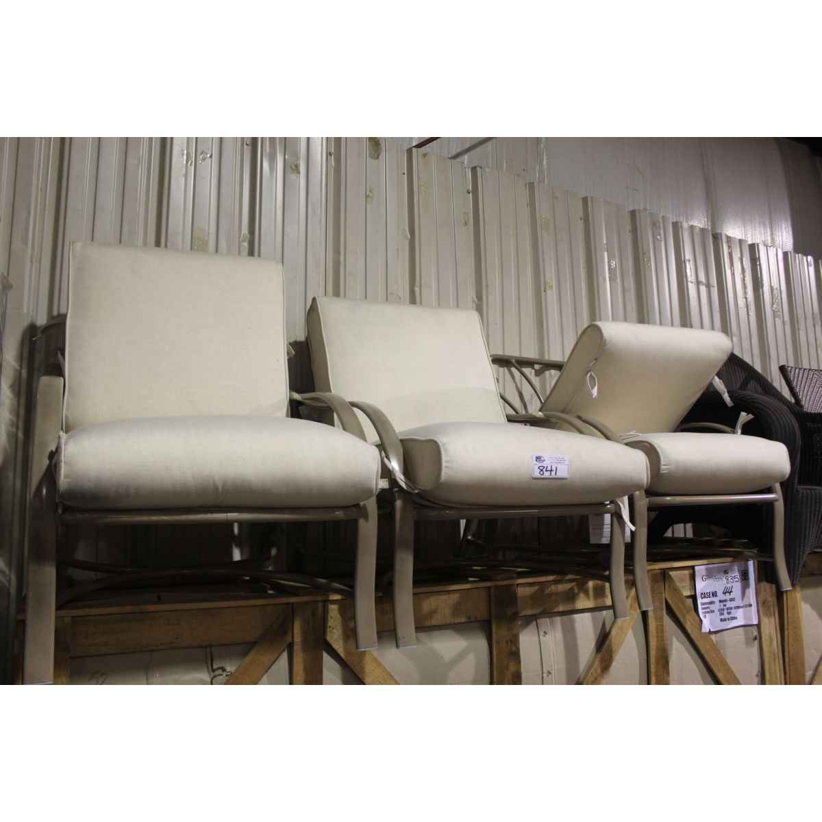 3 SPECKLED METAL PATIO CHAIRS WITH CUSHIONS
