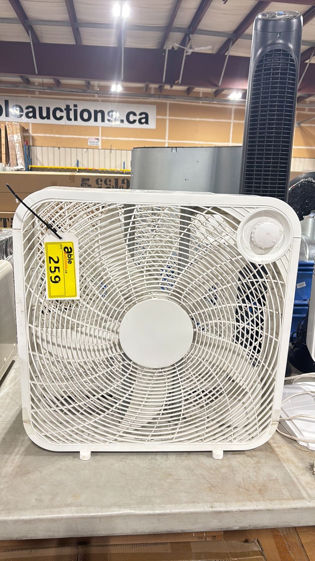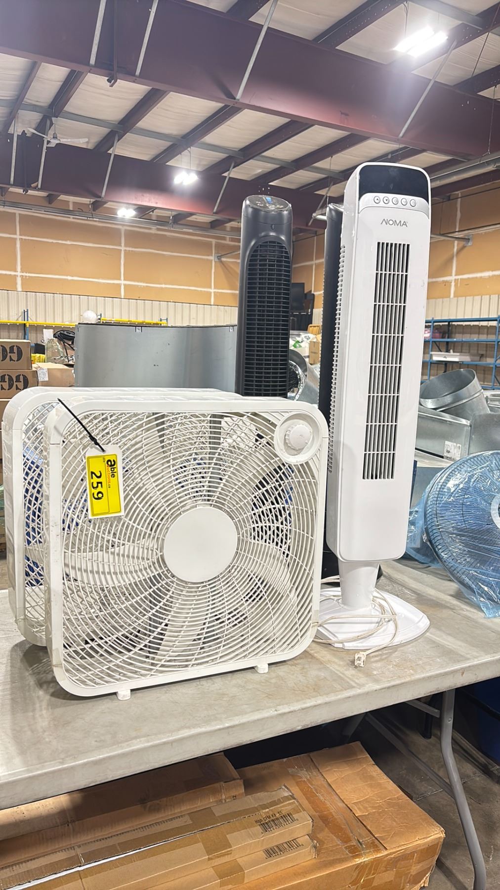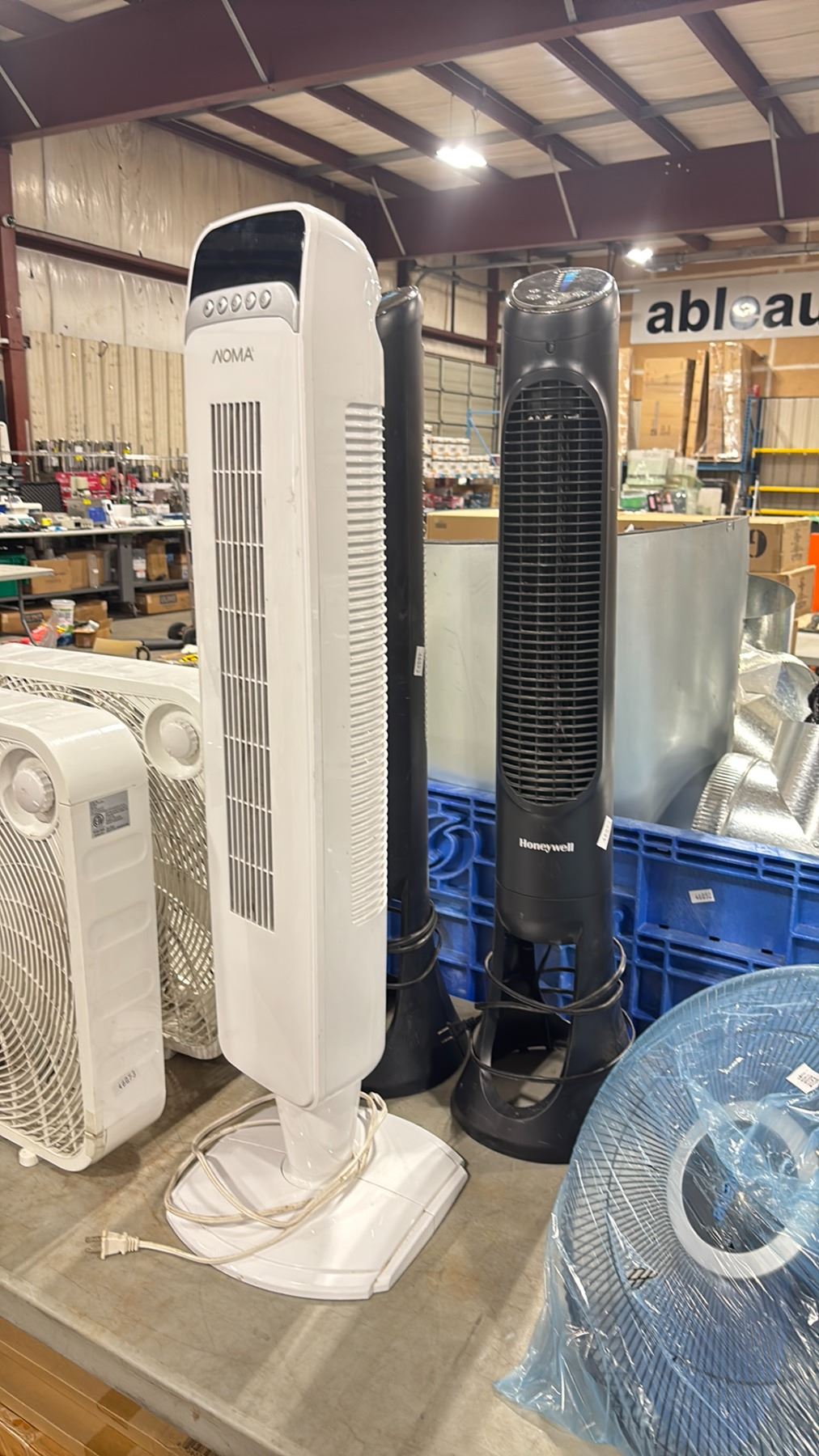 3 STANDING OSCILLATING FANS & 2 WHITE HONEYWELL BOX FANS
