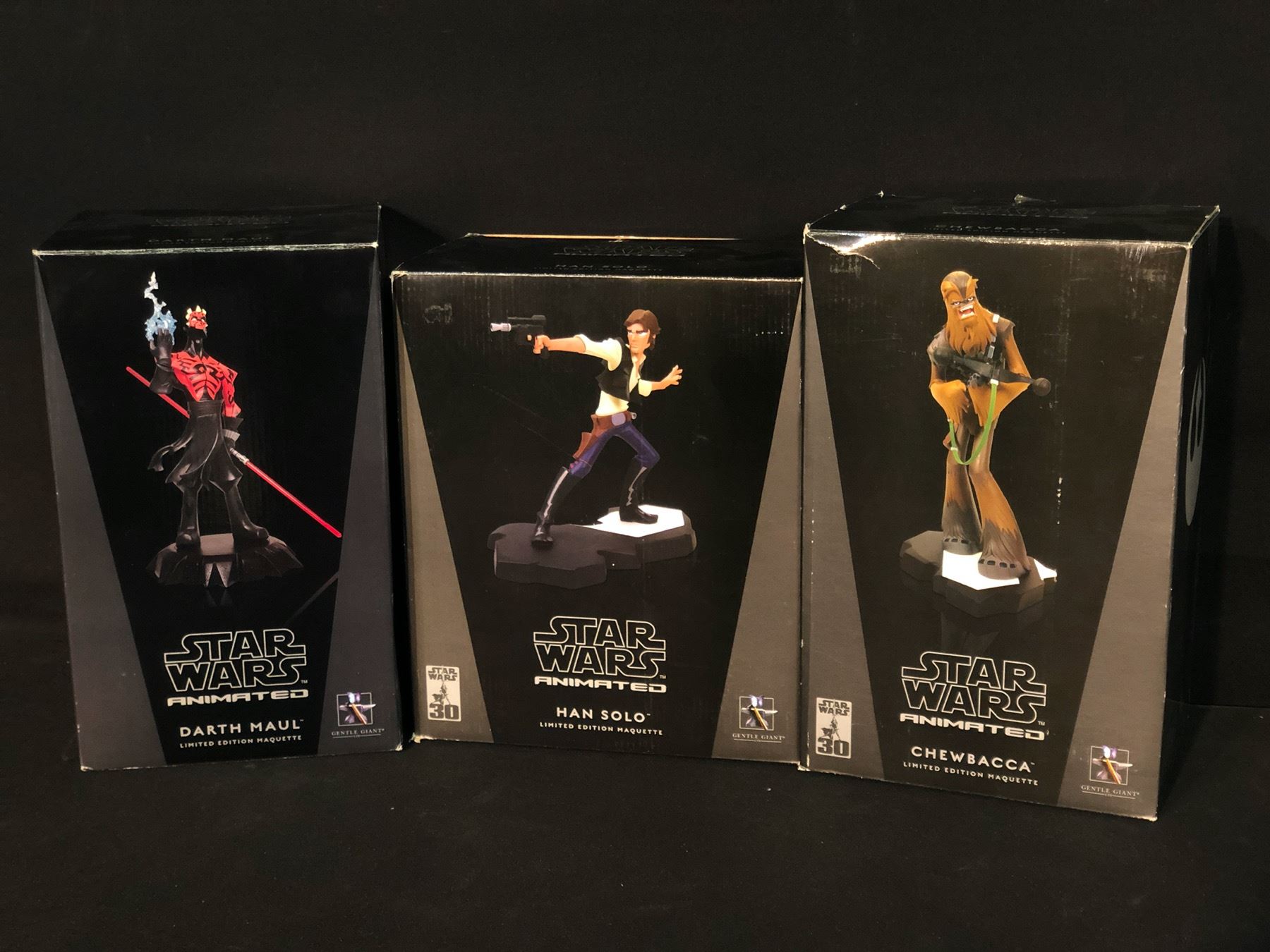 3 STAR WARS ANIMATED LIMITED EDITION STATUES INC. DARTH MAUL, HAN SOLO, AND CHEWBACCA, ALL IN