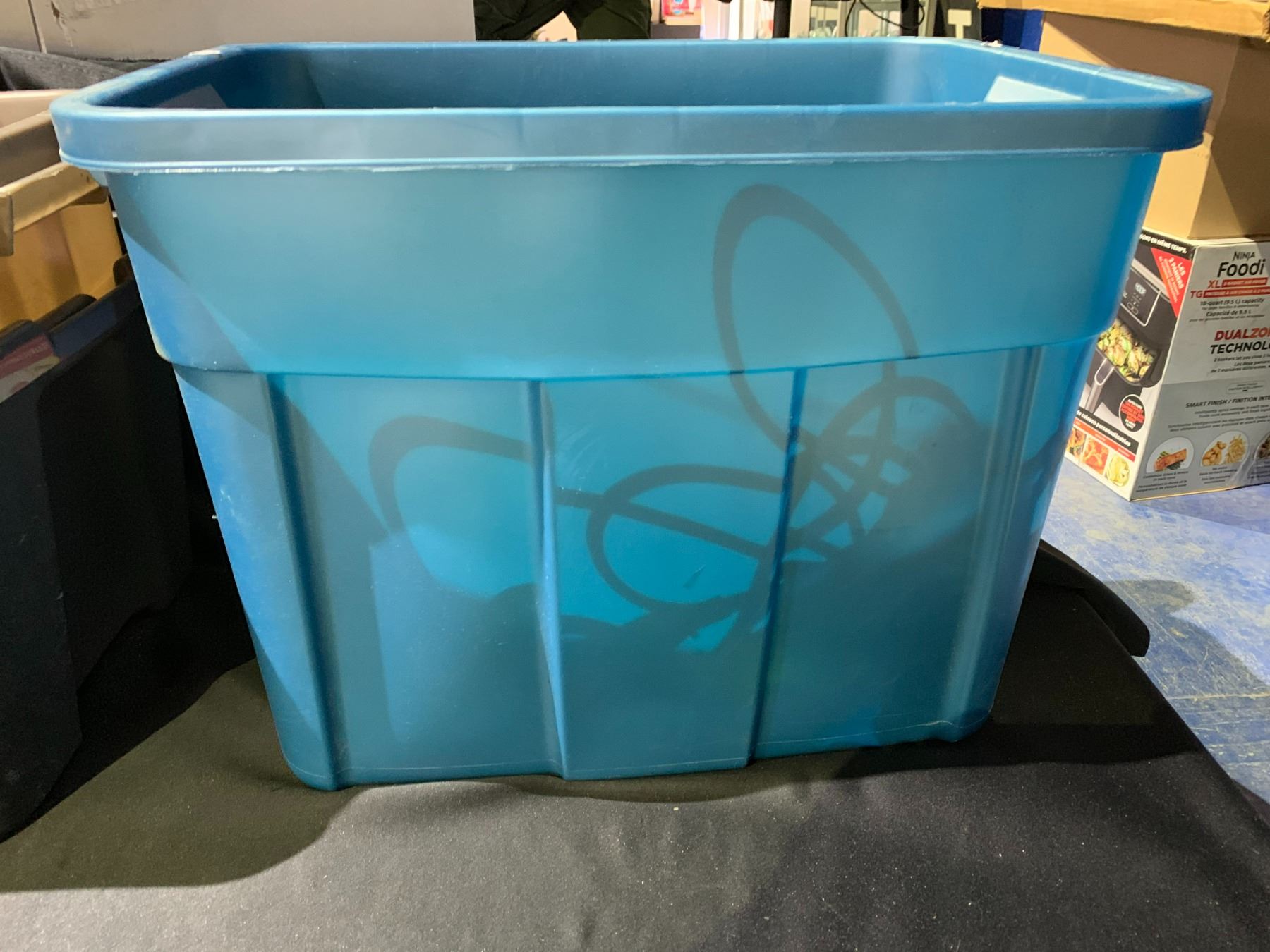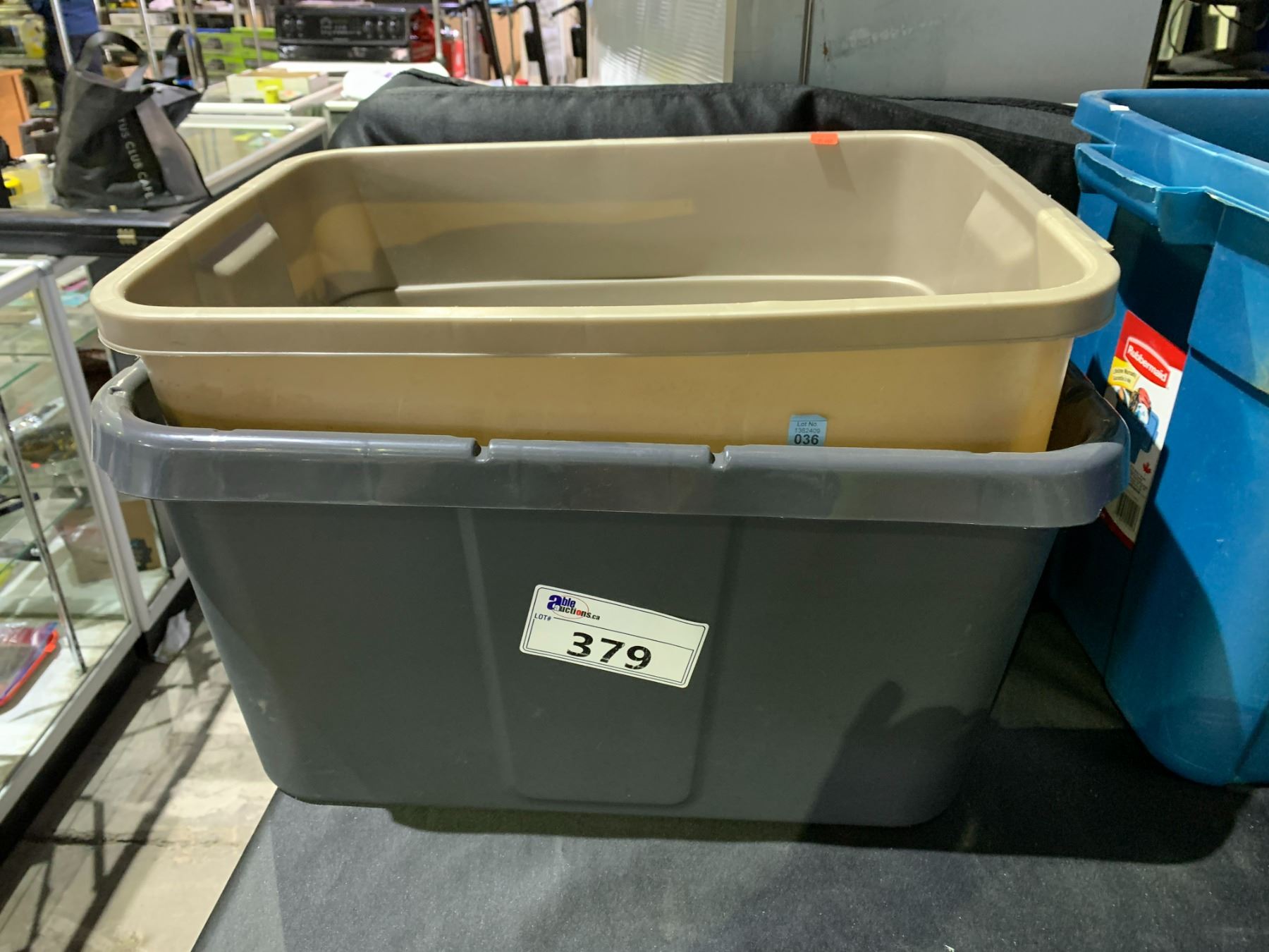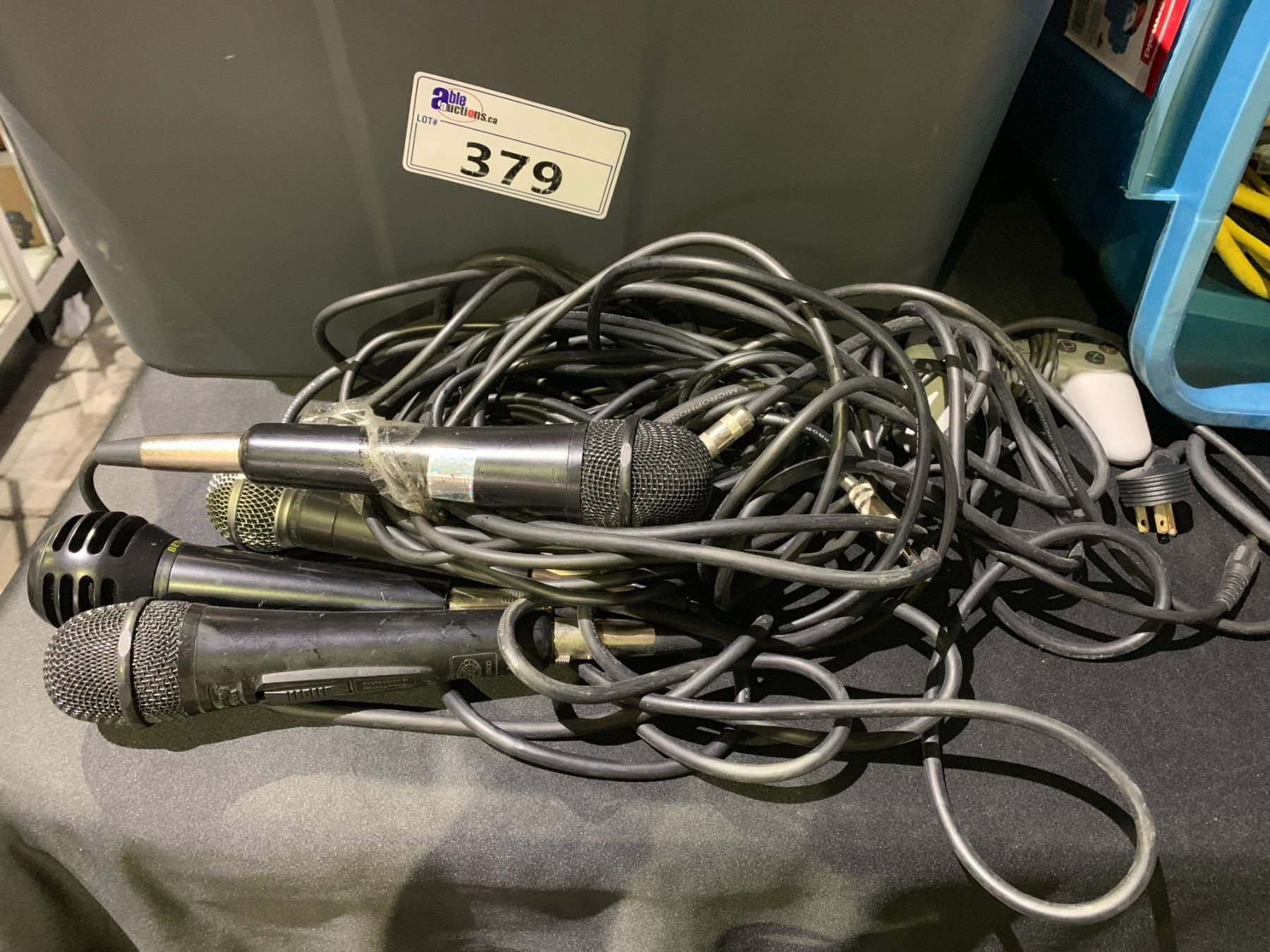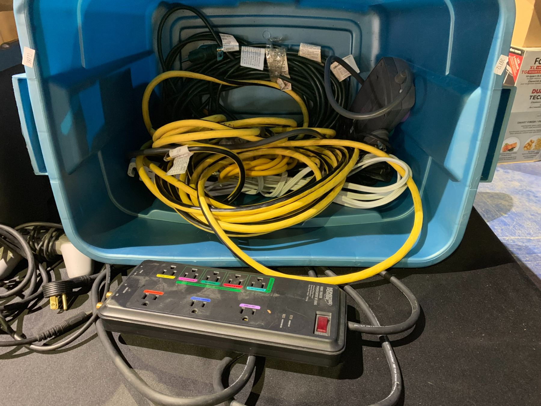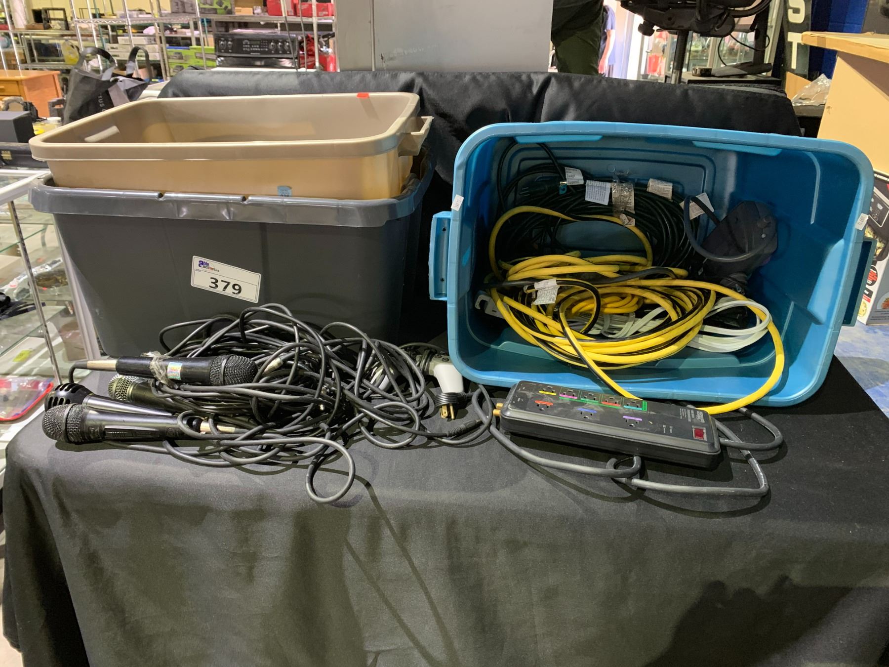 3 STORAGE BINS ONE CONTAINING CORDS, MICROPHONES AND MORE