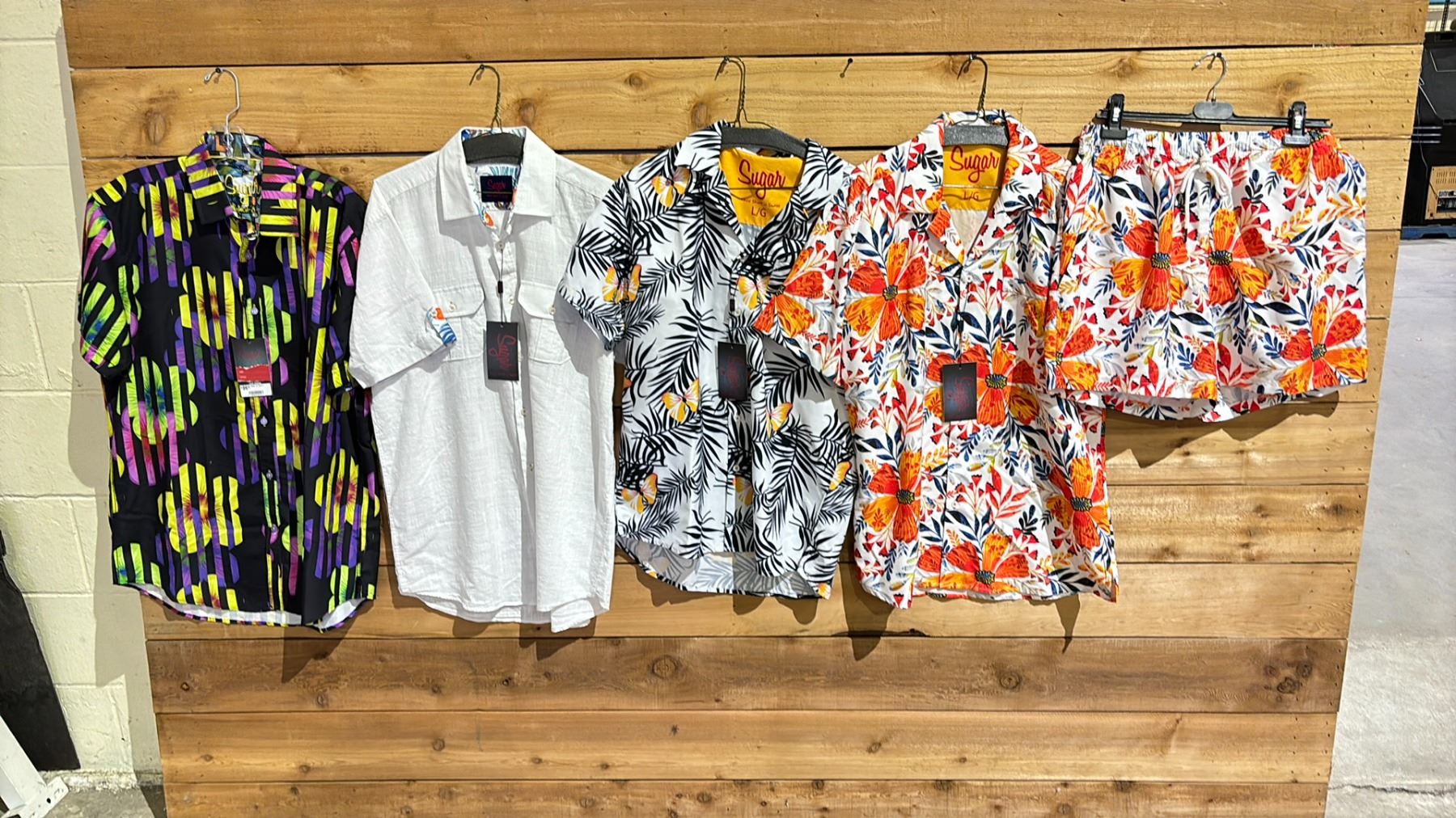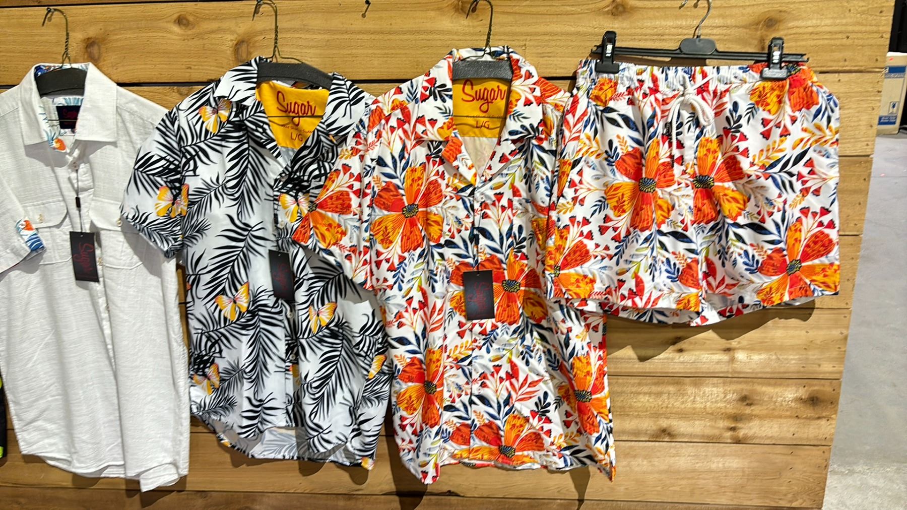 3- SUGAR T-SHIRT BUTTON DRESS SHIRTS, AND 1-SHIRT AND SHORT SET SIZE LARGE
