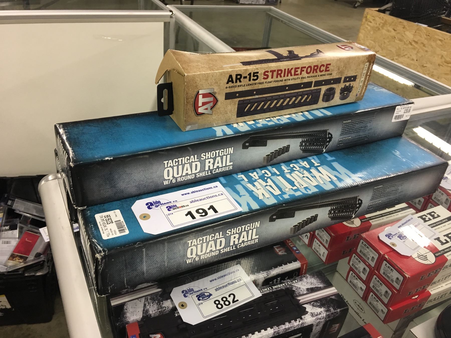 3 TACTICAL SHOTGUN QUAD RAIL W/ 6 ROUND SHELL CARRIERS, AND ONE AR-15 STRIKEFORCE 6 SIDED RIFLE LENGTH FREE FLOAT FOREND WITH UTILITY RAIL PACKAGE & NOSE CONE