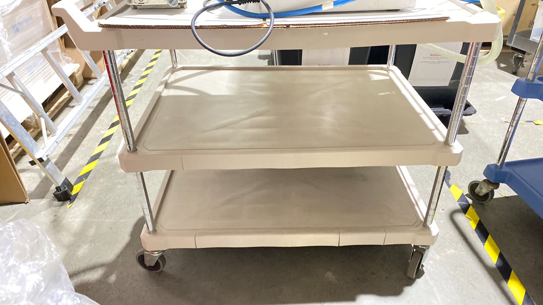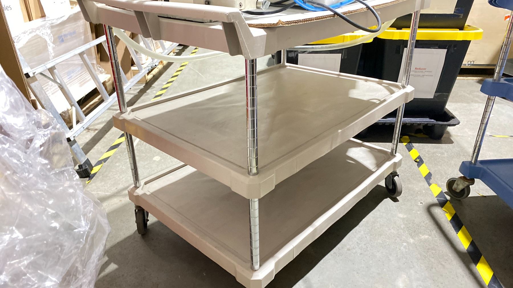 3 TIER BEIGE AND CHROME ROLLING CART (CONTENTS NOT INCLUDED)