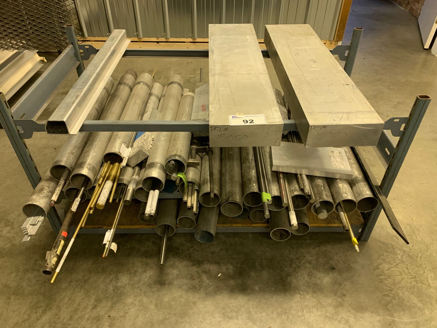 3 TIER METAL RACK INCLUDING ; ASSORTMENT OF READY ROD, PIANO HINGE & BRASS ROUND STOCK & ASSORTED ROUND STOCK