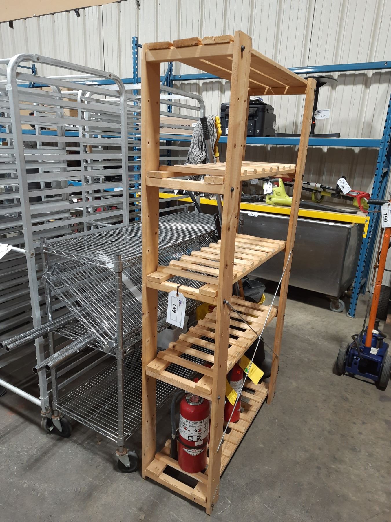 3 TIER METRO RACK WITH ASSORTED COMMERCIAL JANITORIAL EQUIPMENT, 3 FIRE EXTINGUISHERS & WOODEN 4 TIER WINE RACK