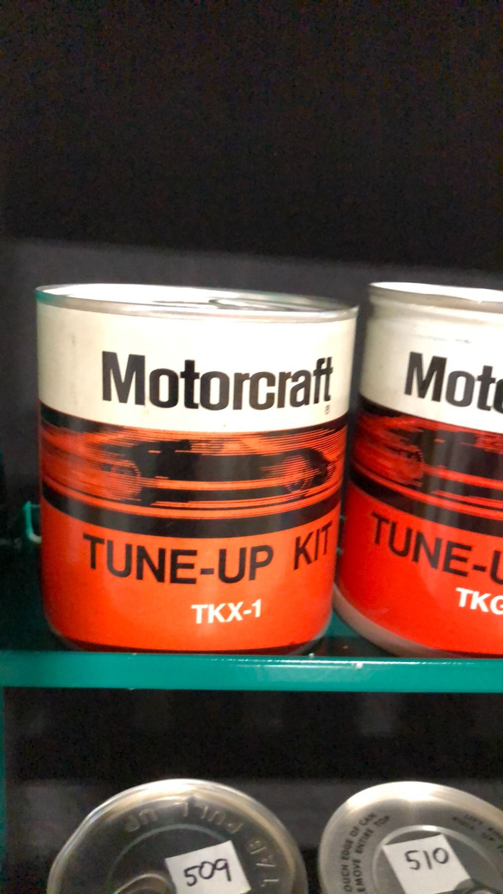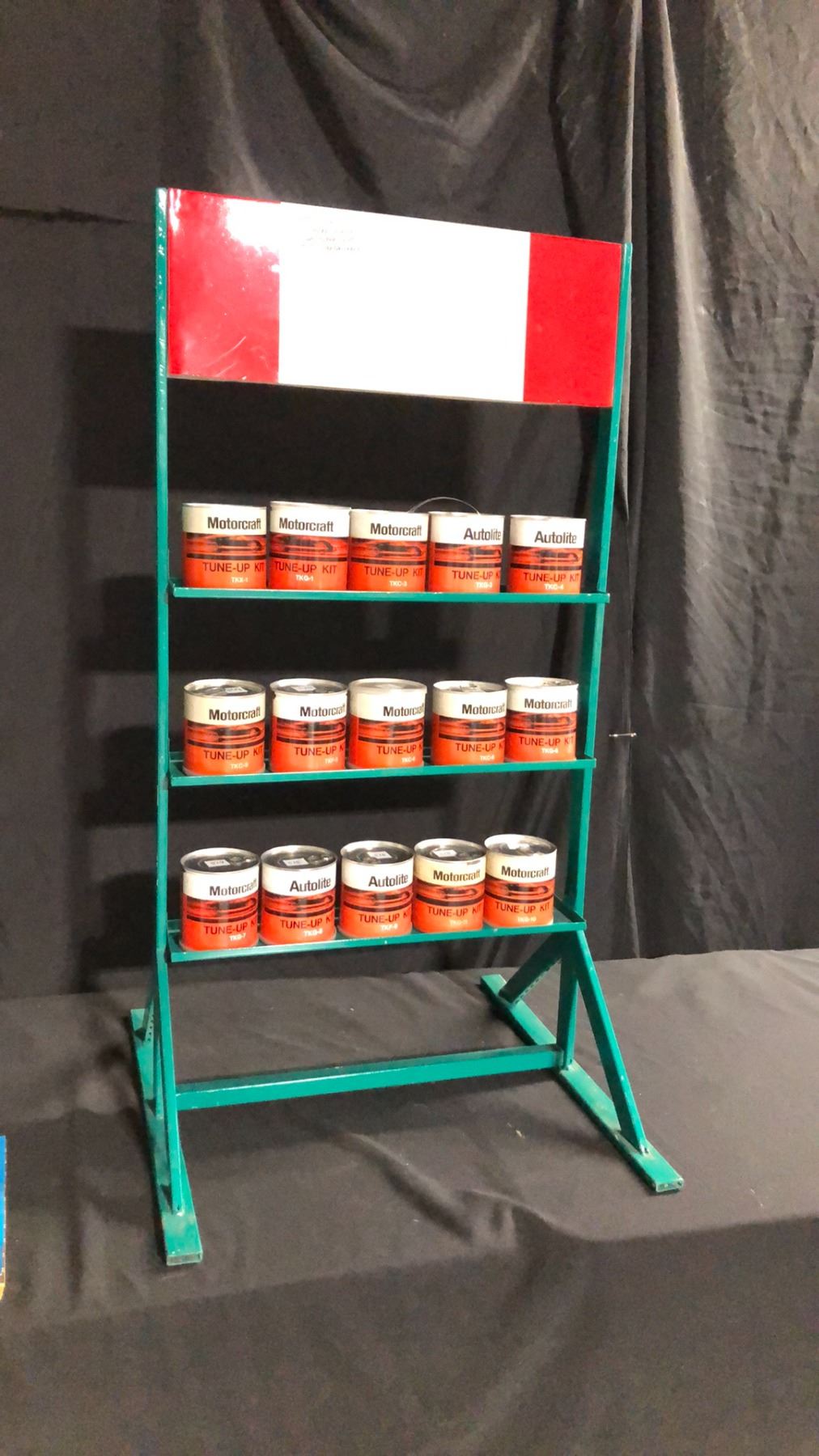 3-TIER RACK MOTORCRAFT 1977 CATALOG AND 14 ASSORTED SEALED MOTORCRAFT TUNE-UP KIT AND TKC-6 CAN WITH 8 SPARK PLUGS