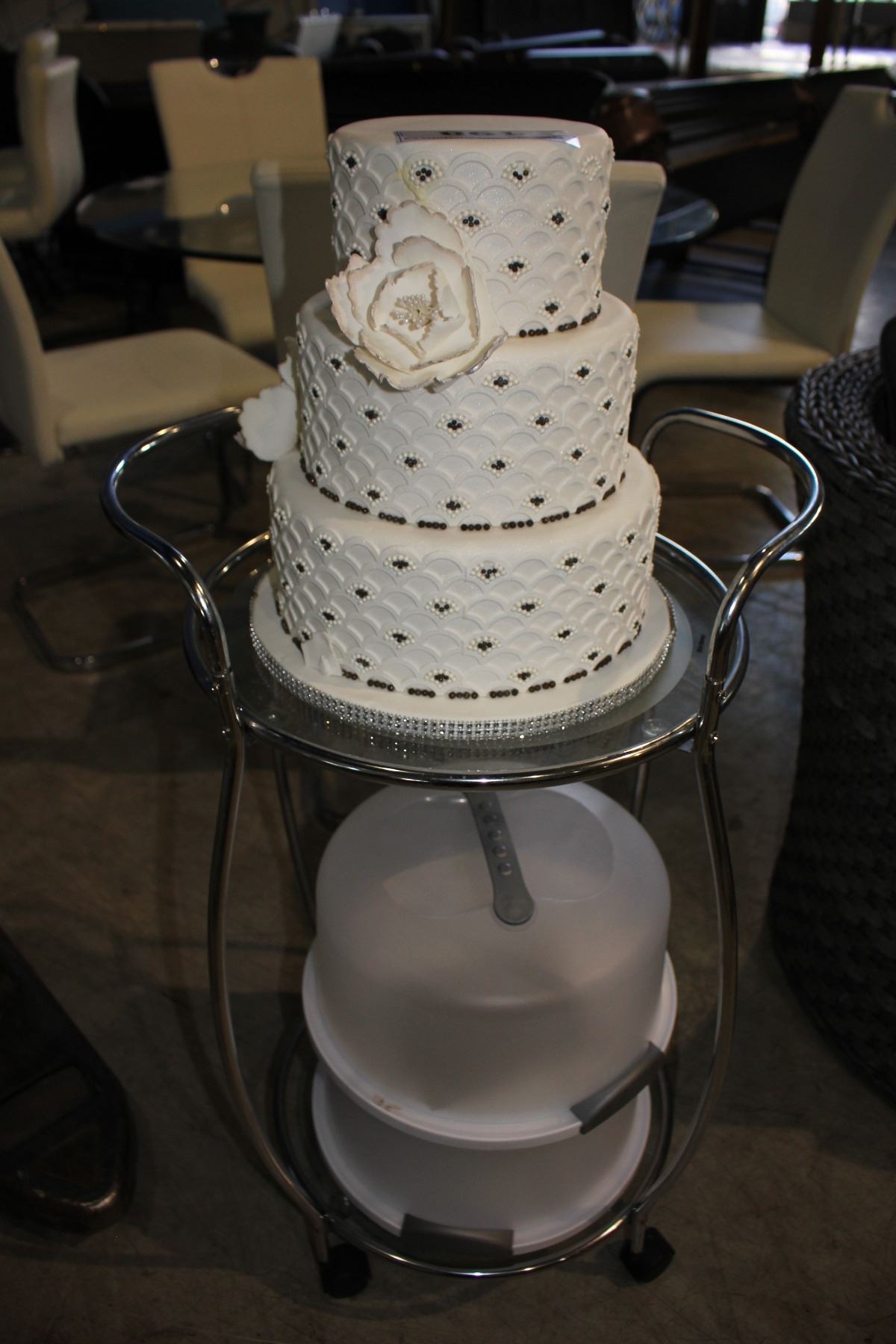 3 TIER WEDDING CAKE MODEL ON 2 TIER ROLLING CART WITH CONTENTS