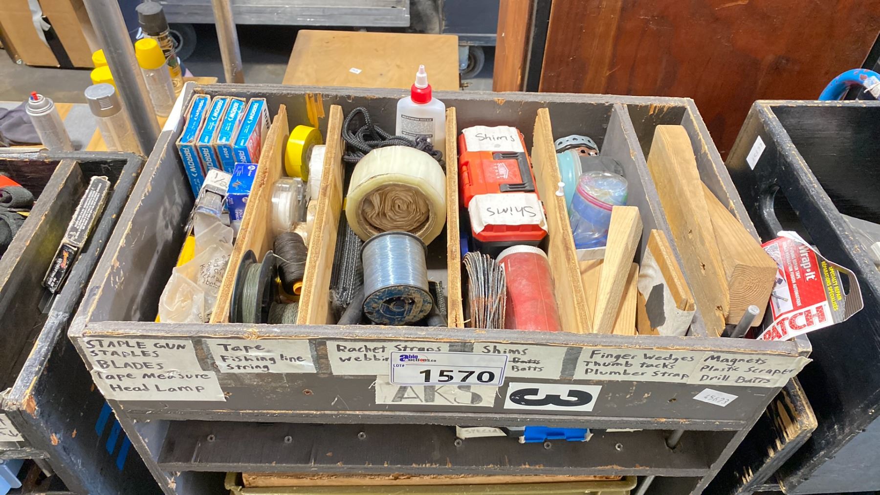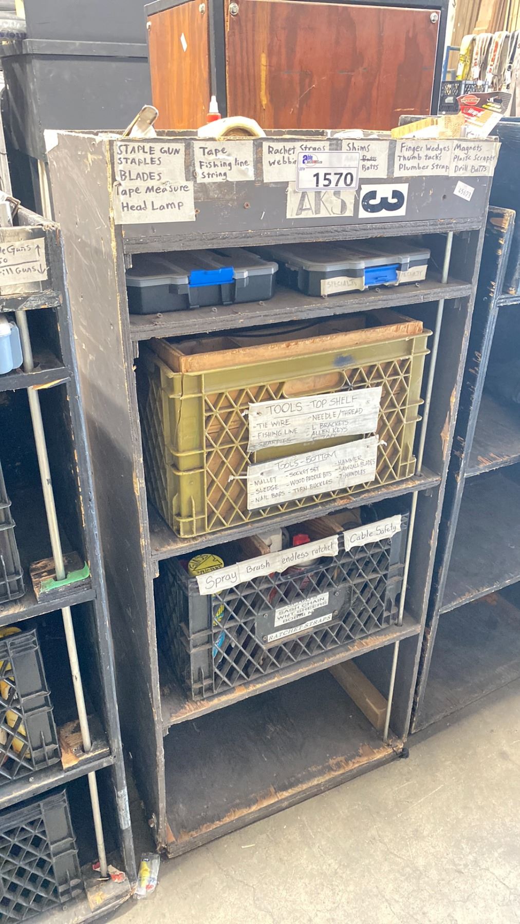 3 TIER WOODEN SHELF STAND WITH CRATES OF ASSORTED HARDWARE AND SPRAY CANS. *CRATES INCLUDED*