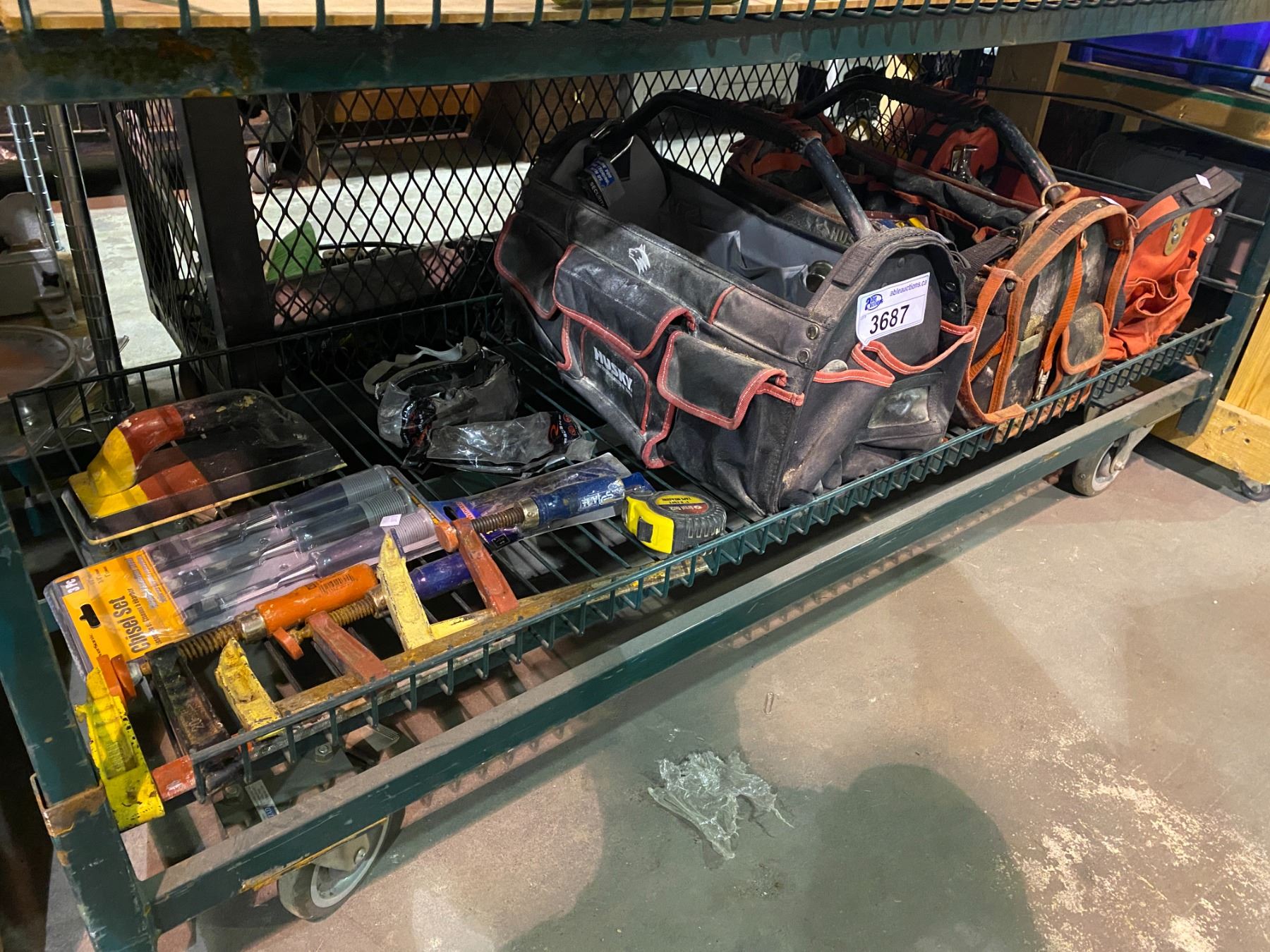 3 TOOL BAGS WITH CONTENTS, CLAMPS, CHISEL SET, & MORE