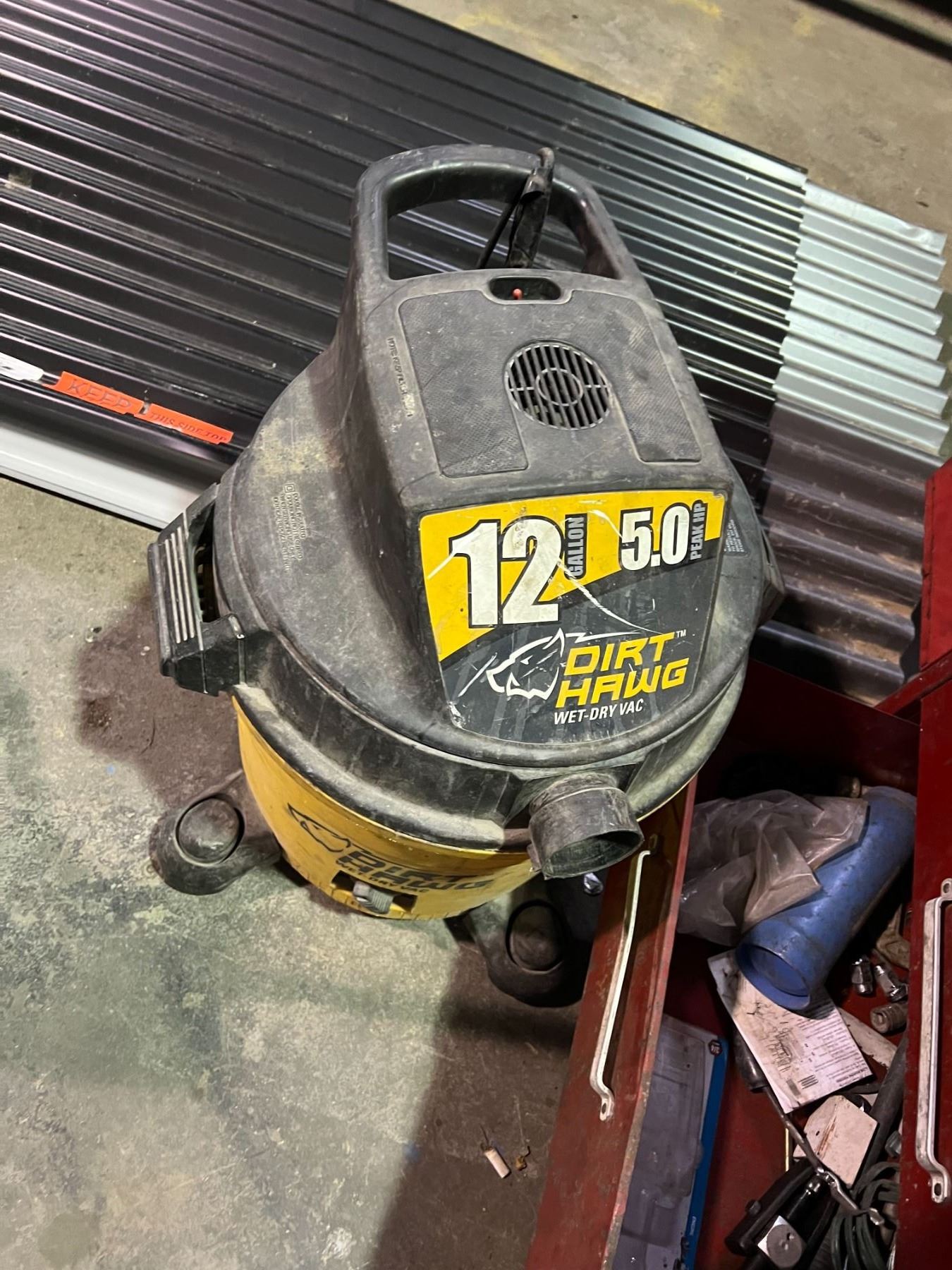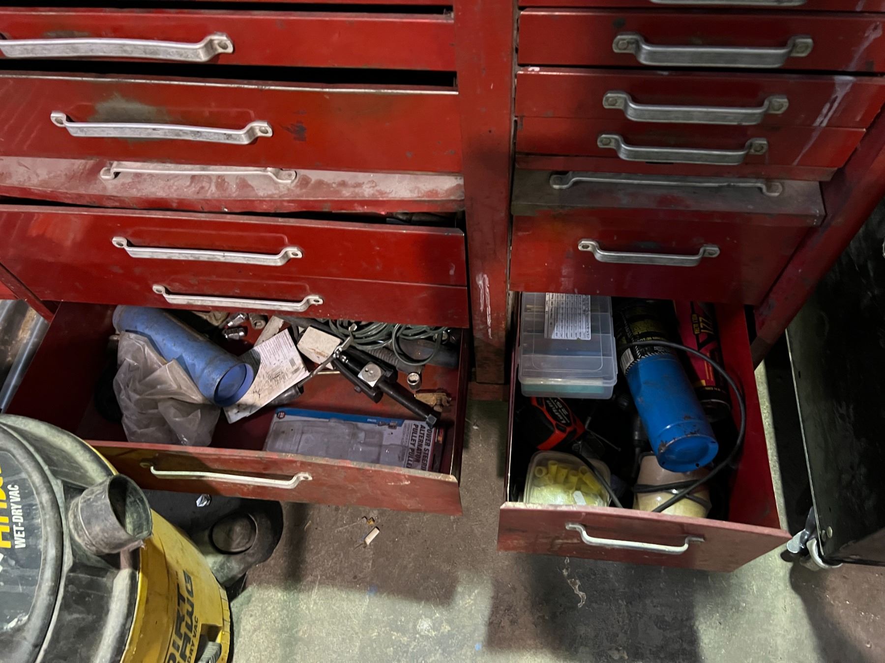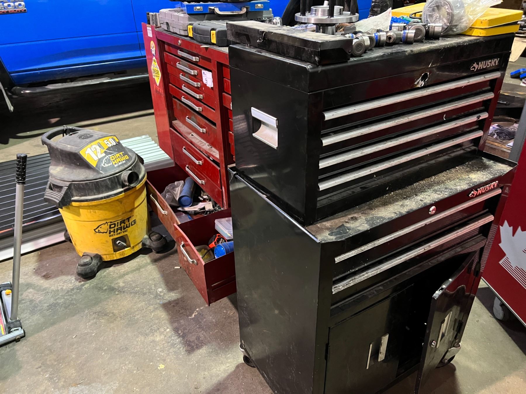 3 TOOL BOXES PLUS OTHER SMALL TOOL BOXES - CONTENTS INCLUDED (SOCKETS, DRILL BITS, TAPE MEASURE, TORCH. RUBBER HAMMER, FLASHLIGHT ETC AND 12GAL 5HP DIRT DAWG WET/DRY VAC