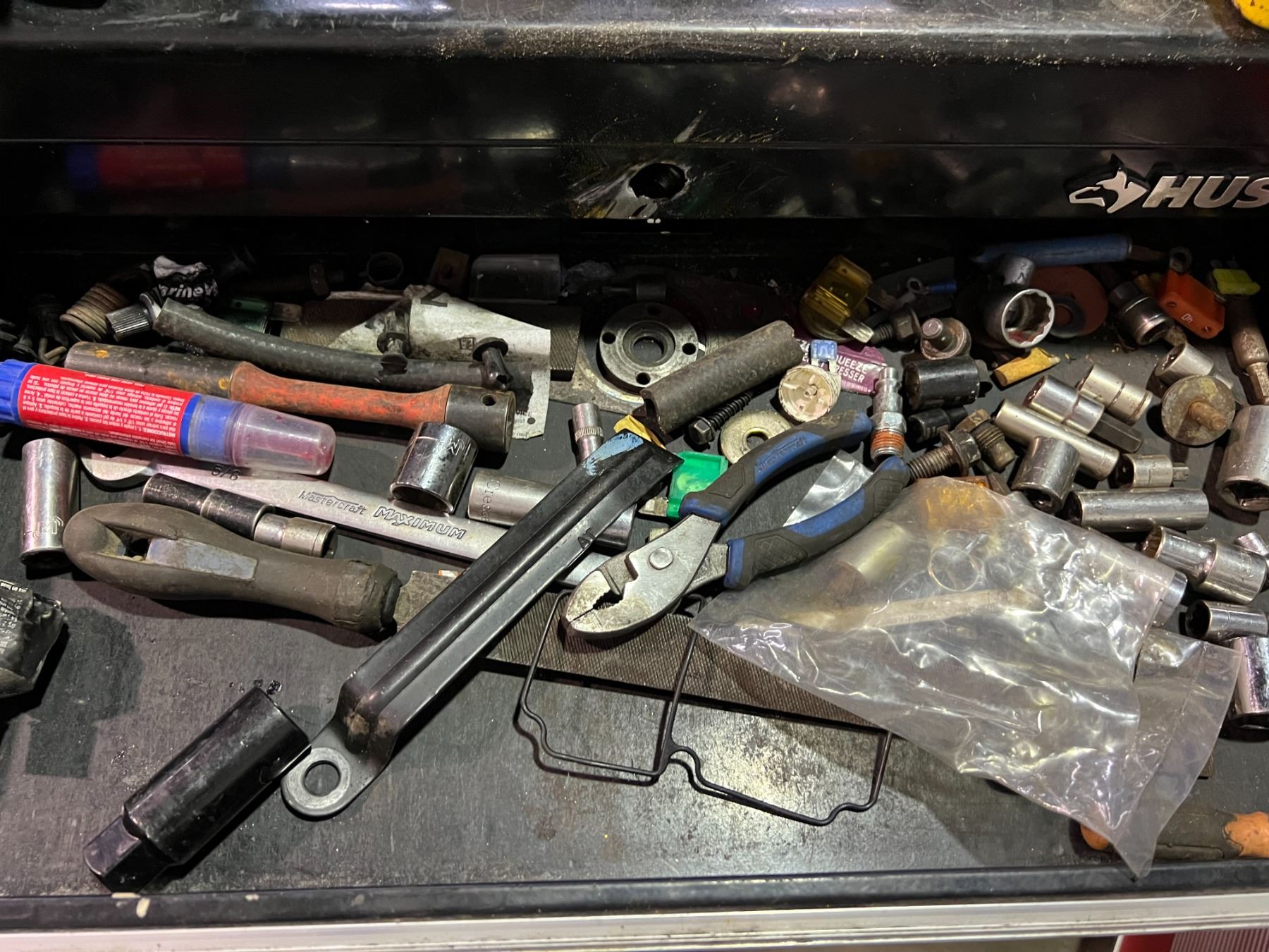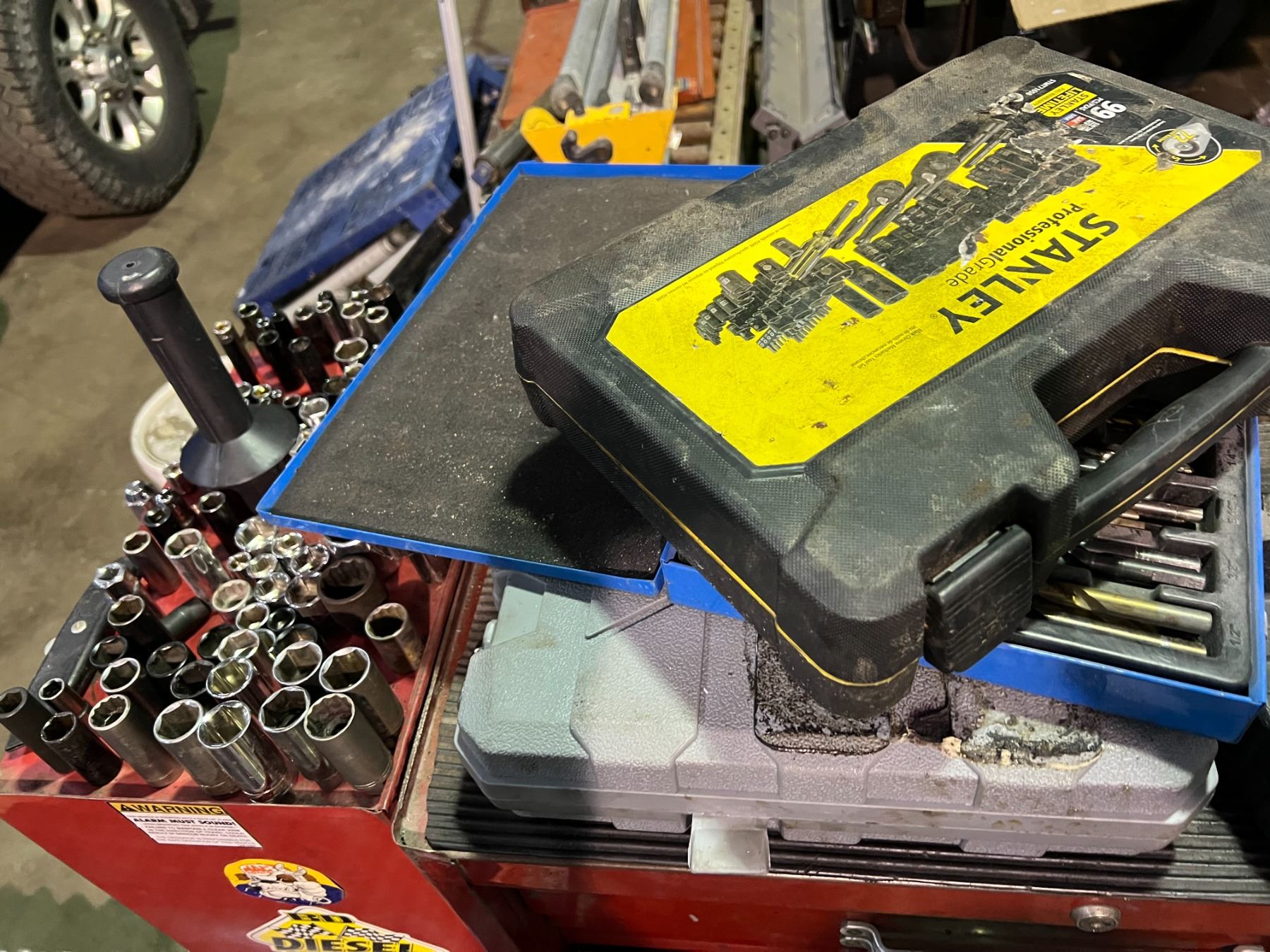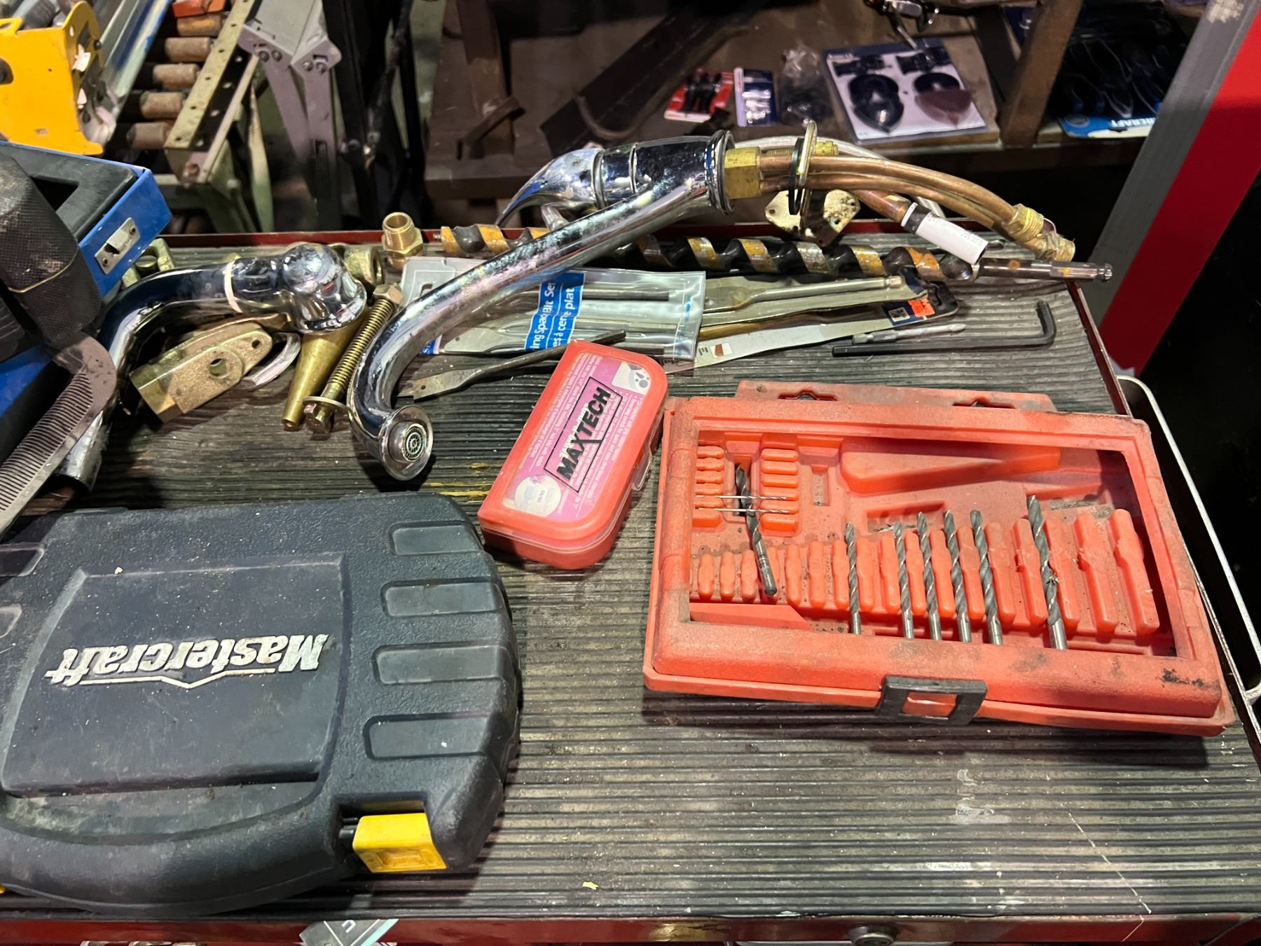 3 TOOL BOXES PLUS OTHER SMALL TOOL BOXES - CONTENTS INCLUDED (SOCKETS, DRILL BITS, TAPE MEASURE, TORCH. RUBBER HAMMER, FLASHLIGHT ETC AND 12GAL 5HP DIRT DAWG WET/DRY VAC
