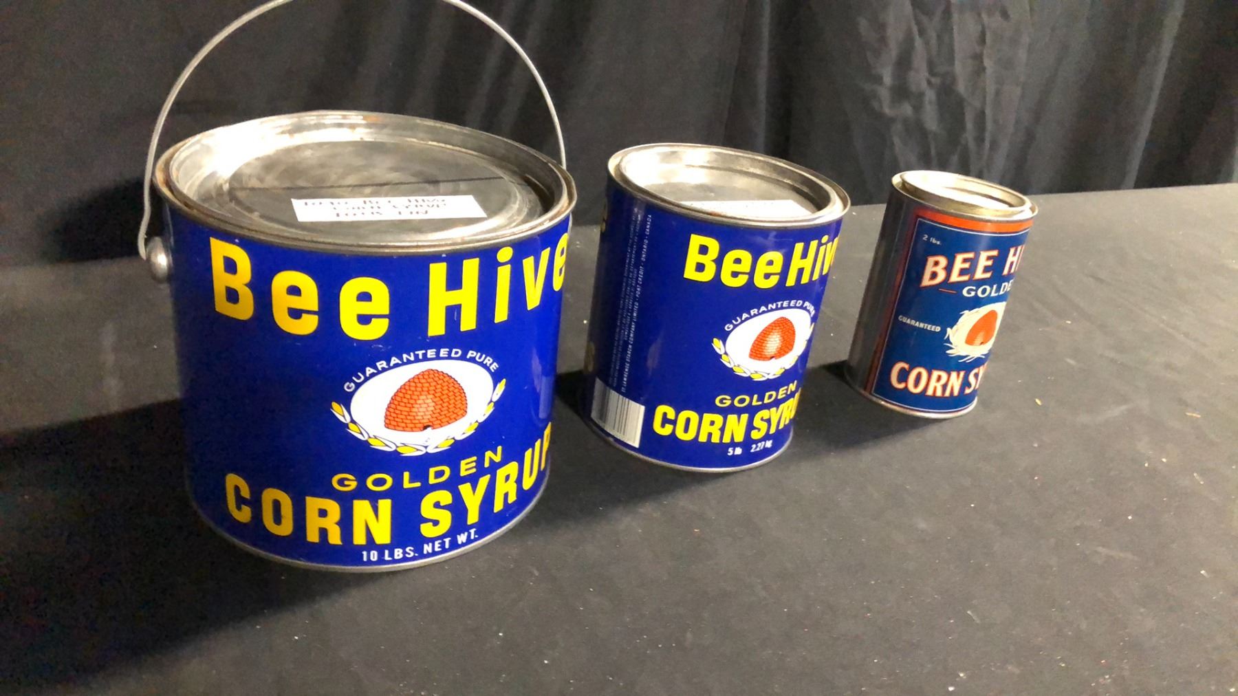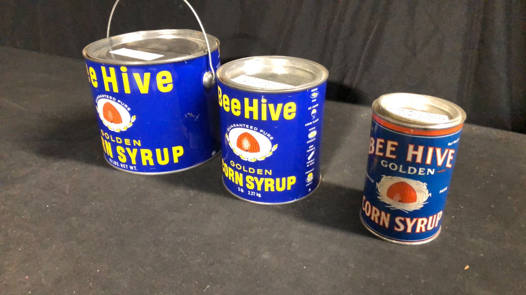 3 VINTAGE BEE HIVE CORN SYRUP TINS 10, 5, 2 POUND