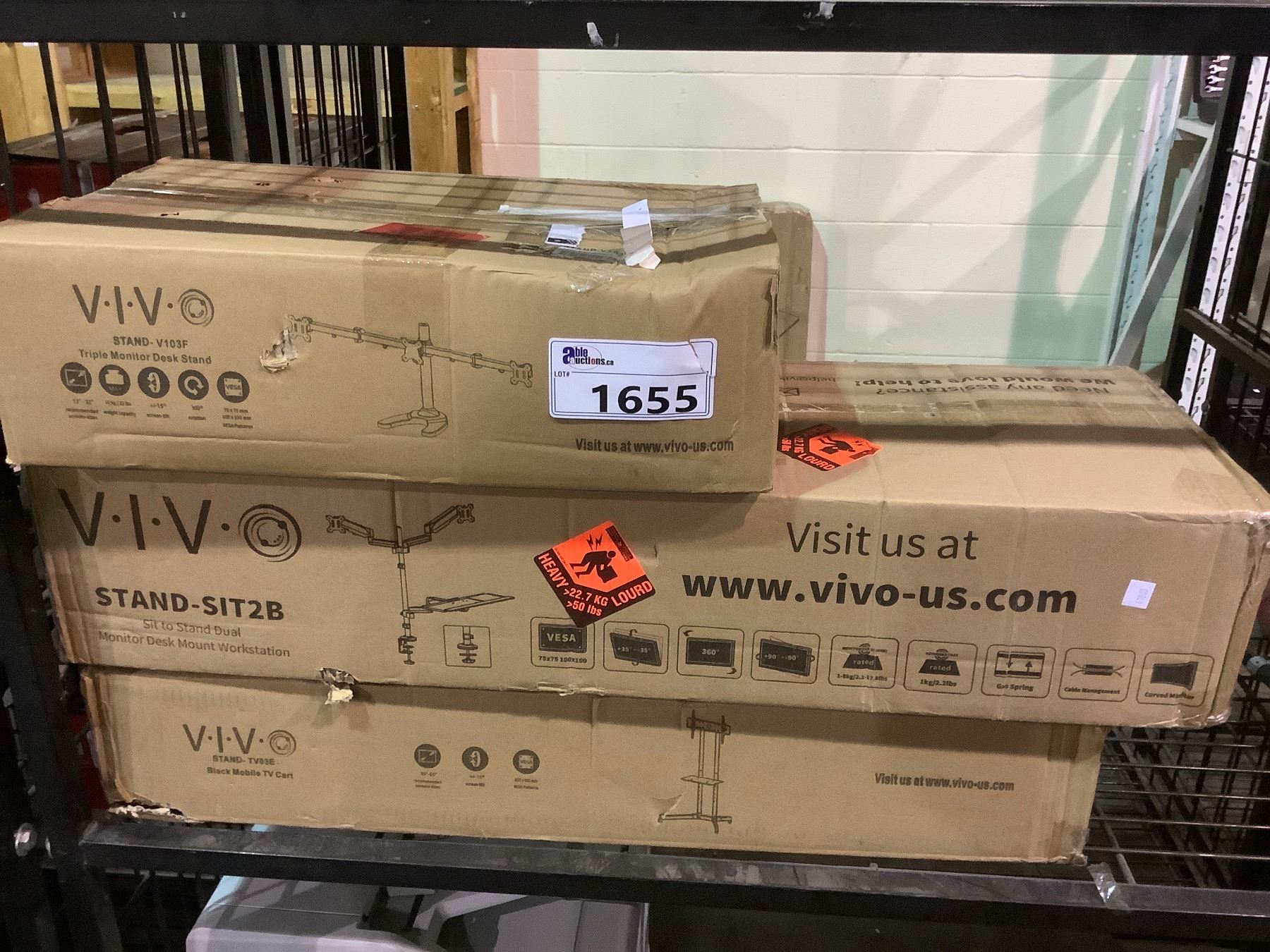 3 VIVO PRODUCTS : TRIPLE MONITOR DESK STAND (STAND V103F), SIT TO STAND DUAL MONITOR DESK MOUNT WORKSTATION (STAND SIT2B), AND BLACK MOBILE TV CART (STAND TV03E)