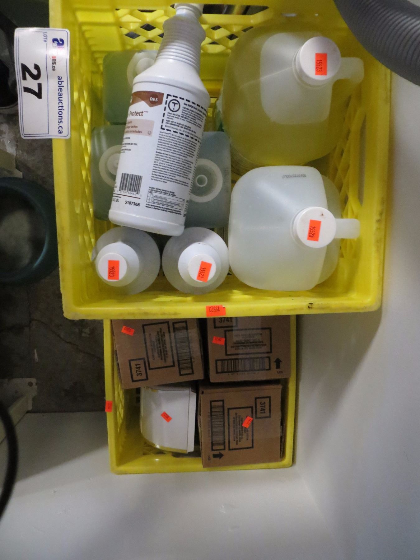 3 YELLOW CRATES OF MISC CLEANING PRODUCT/SOAP DISPENSERS/ETC