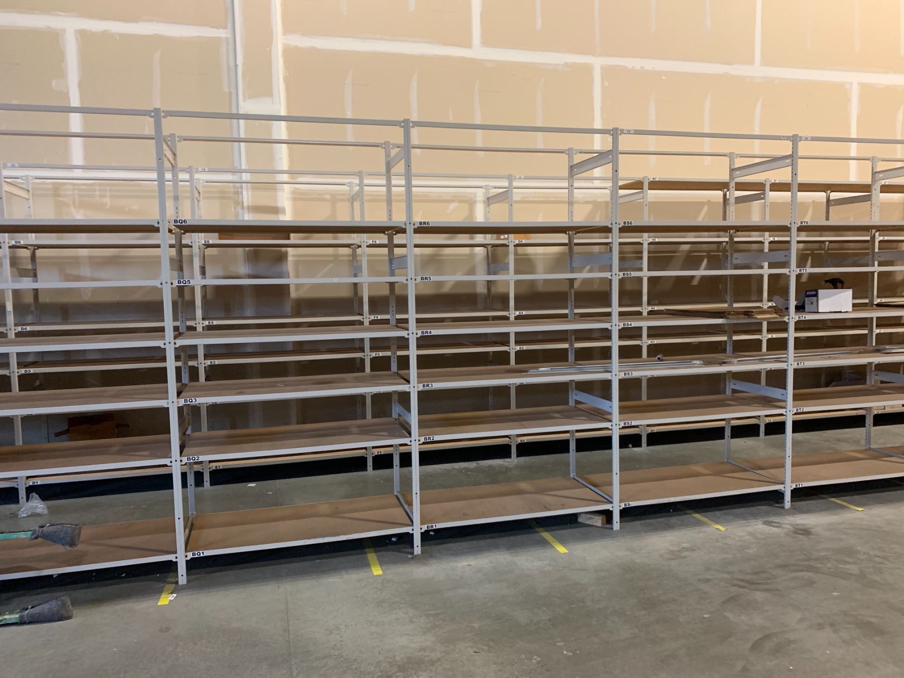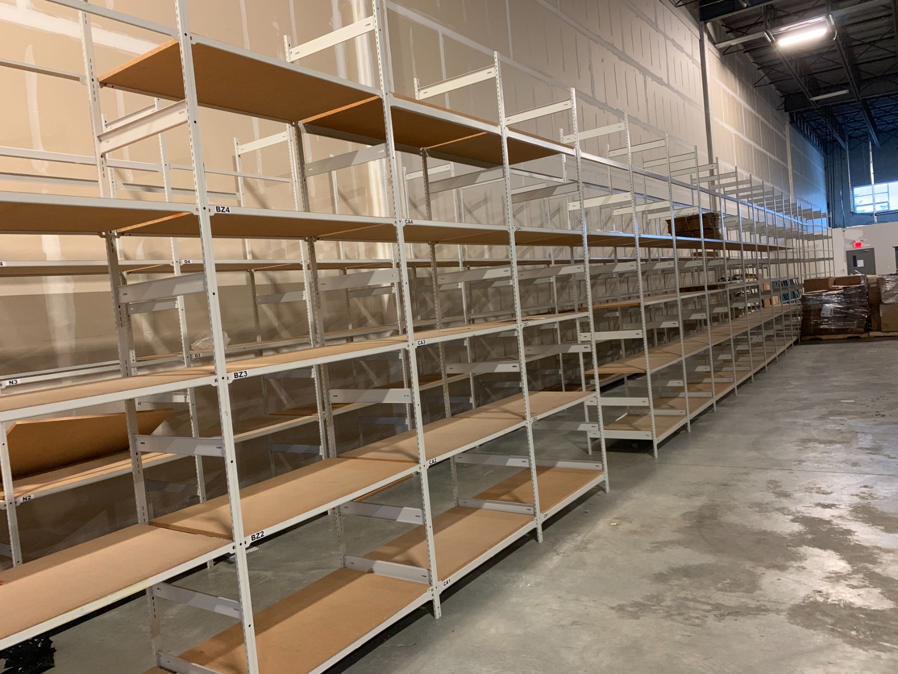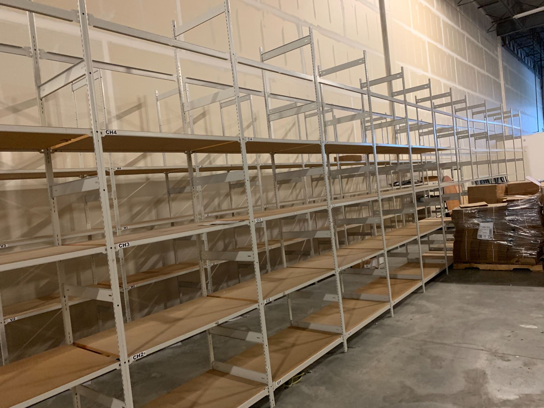 32 BAYS OF 10' X 2' PRODUCT STORAGE SHELVING AND REMAINING CONTENTS INCLUDING UPRIGHTS, CROSSBEAMS AND INSERTS *MUST TAKE ALL* *MUST HAVE PROPER EQUIPMENT AND PERSONNEL FOR REMOVAL*