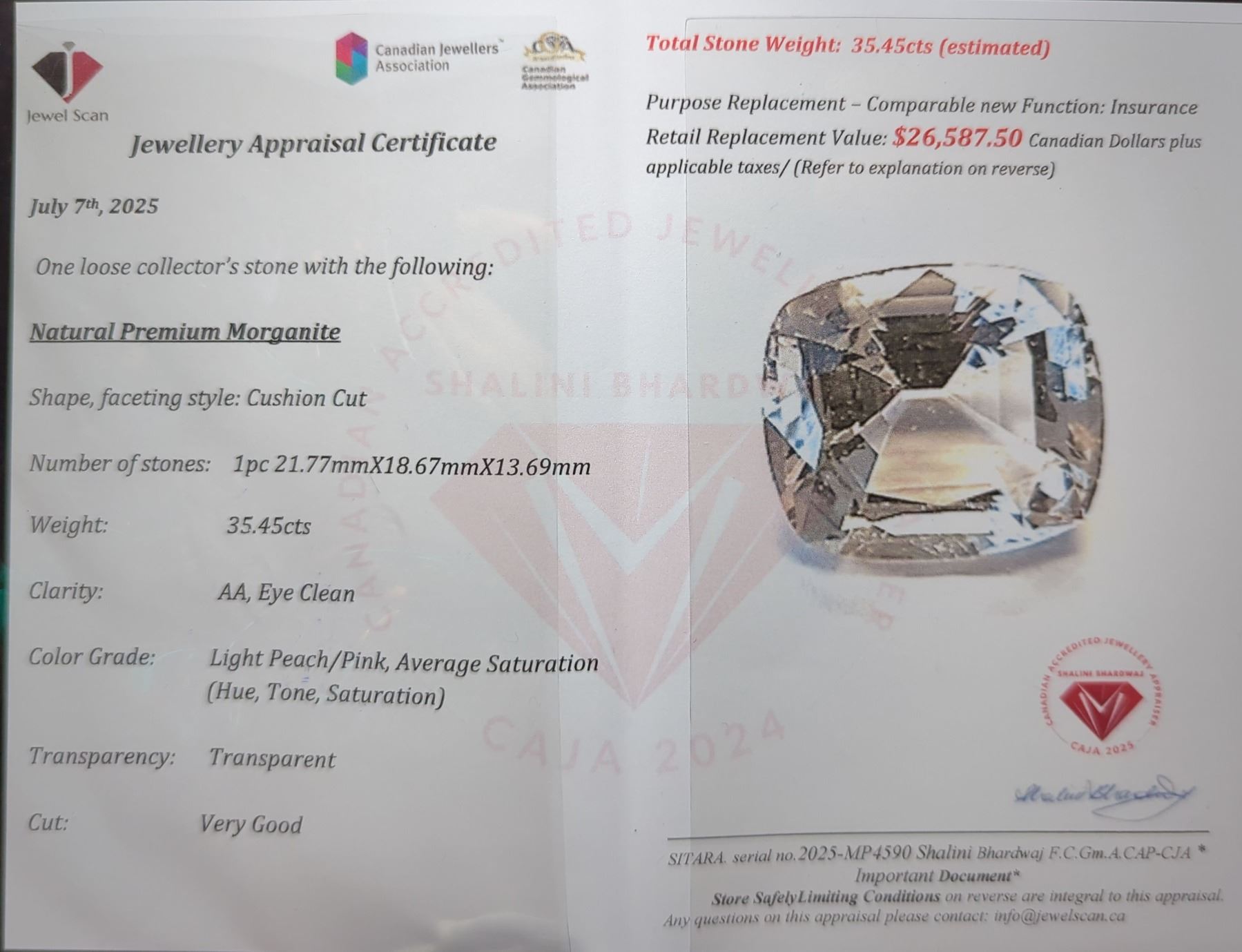 35.45 CT CERTIFIED PINK MORGANITE GEMSTONE ($26,587 APPRAISAL, APPRAISAL NOT GUARANTEED)