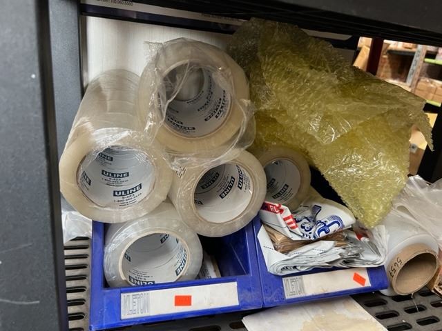 36"W SHELF WITH PADDED ENVELOPES, PACKING TAPE, SHRINK WRAP, ZIPLOCK BAGS, RAZOR KNIVES ETC