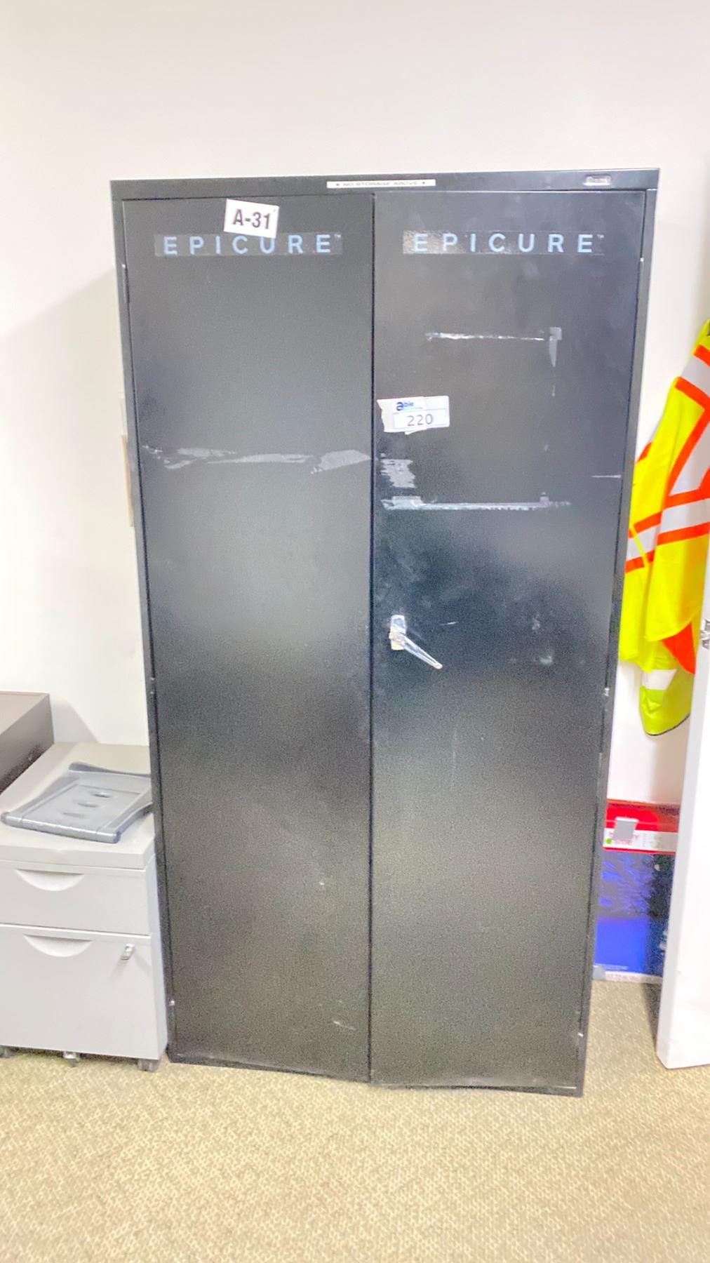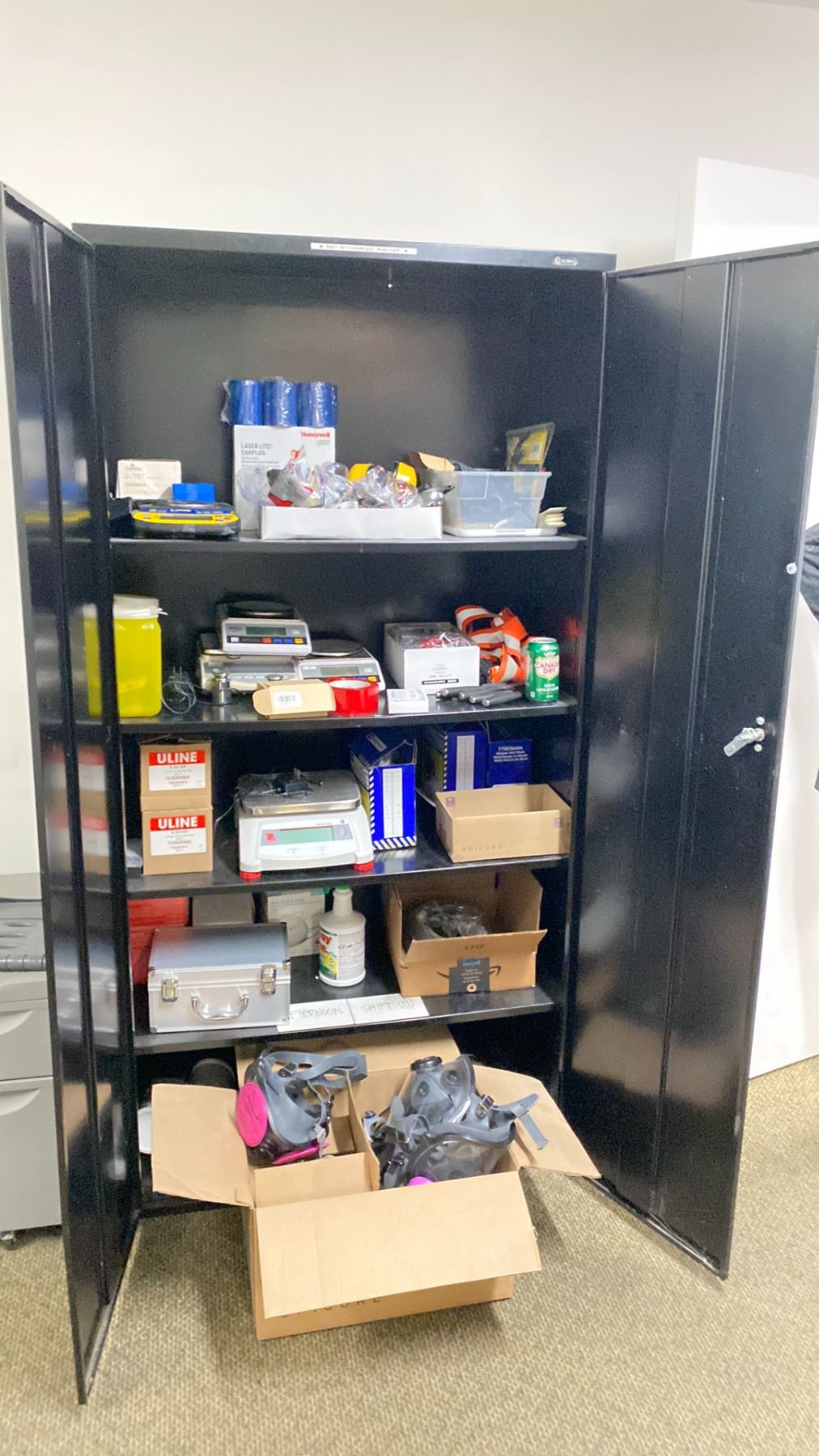 36"X6' METAL CABINET WITH CONTENTS. HANDHELD INJET PRINTER MODEL PIJ127, CALIBRATION WEIGHTS, SCALES, EAR PROTECTORS, EAR PLUGS, RESPIRATORS, VALOR 1000 SCALE, OTHER SCALES, SPRAY 9 CLEANER, SHARPS CONTAINER, RESPIRATOR MASKS, HIGH VIS SUSPENDERS.