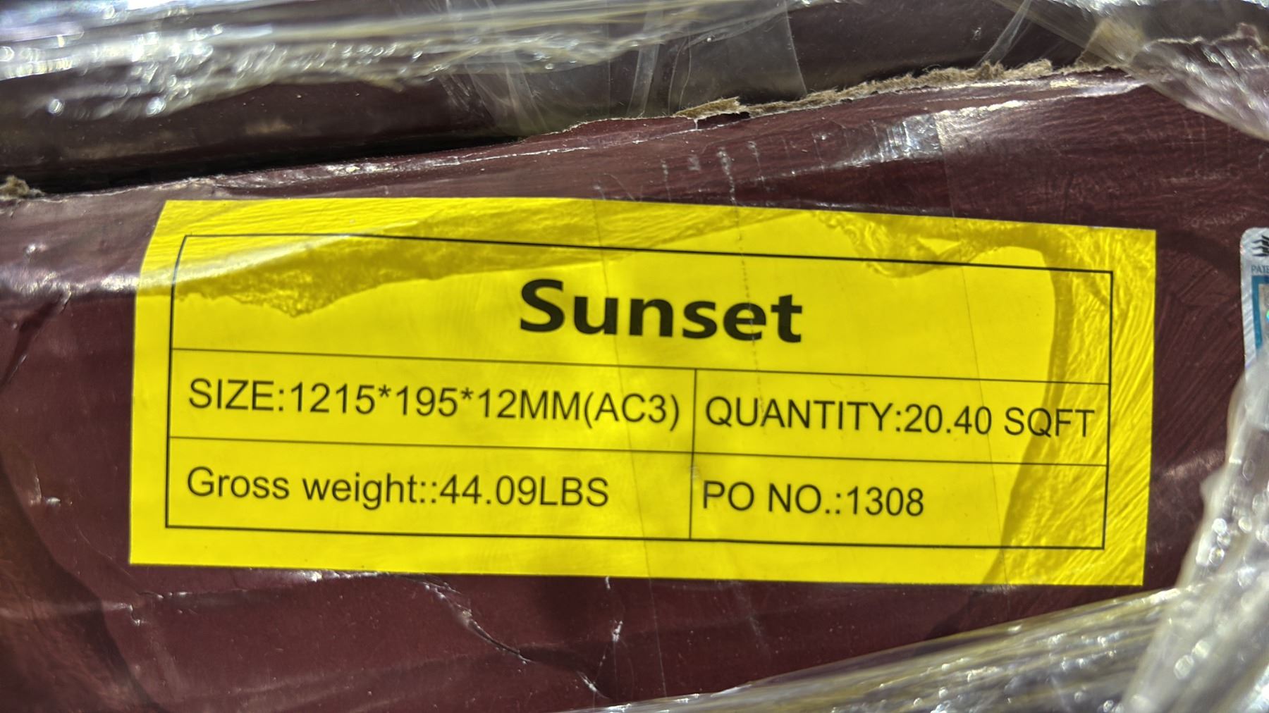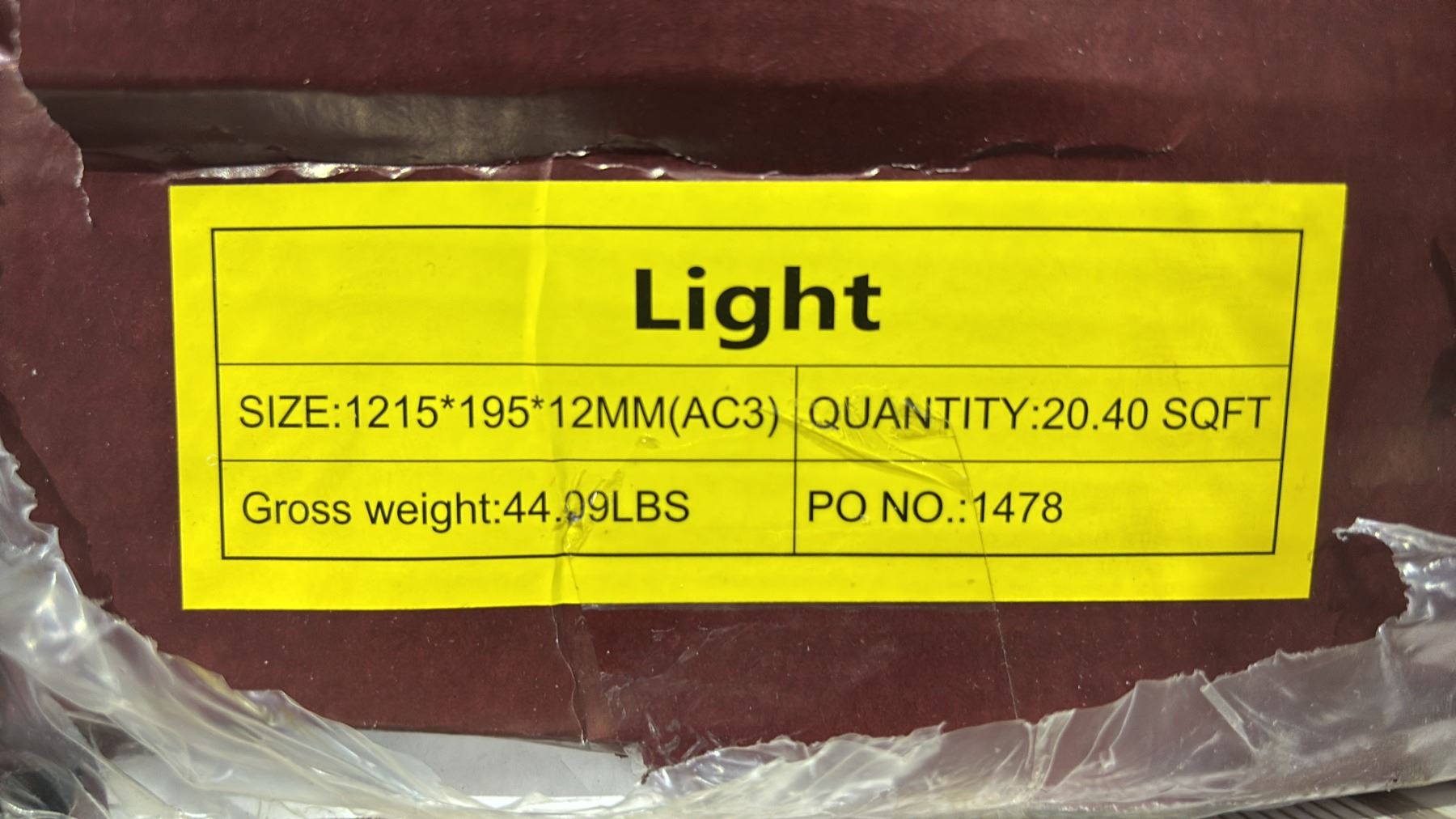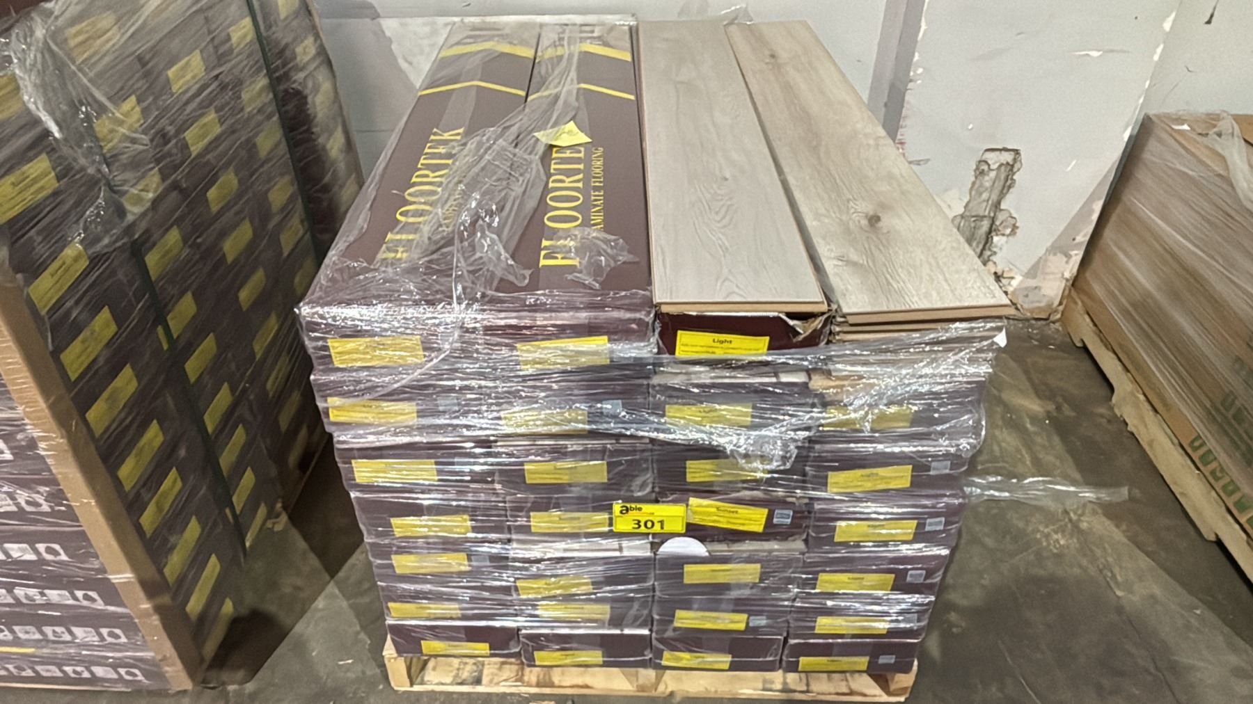 367.20 SQ FT OF FLOORTEK LIGHT 12MM GLUELESS LAMINATE FLOORING 18 BOXES X 20.40 SQ FT & 204 SQ FT OF FLOORTEK SUNSET 12MM GLUELESS LAMINATE FLOORING 10 BOXES X 20.40 SQ FT *MUST TAKE ALL ON PALLET*