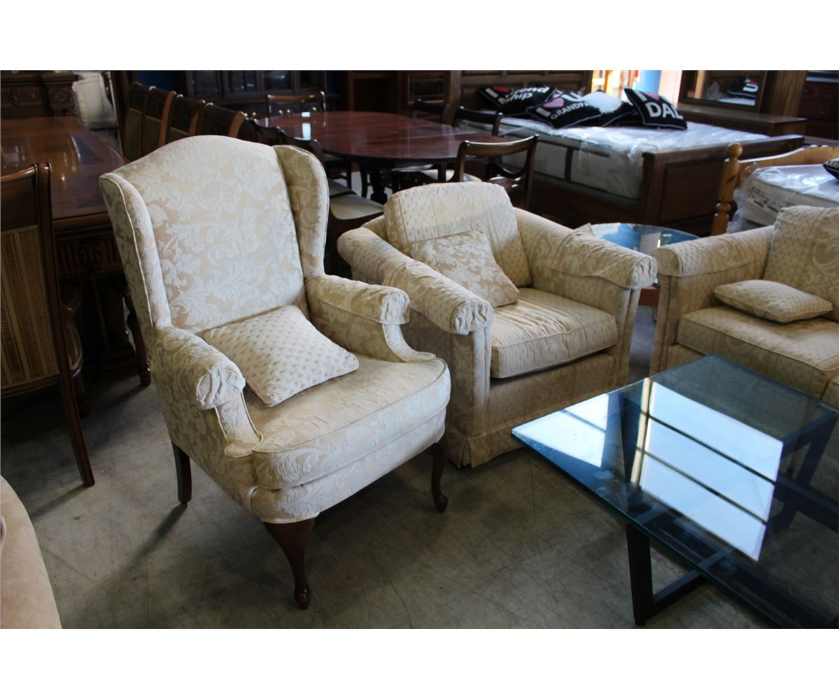 3PC OFF WHITE FLORAL PATTERN UPHOLSTERED SOFA SET; SOFA WITH ARM CHAIR AND WING BACK CHAIR
