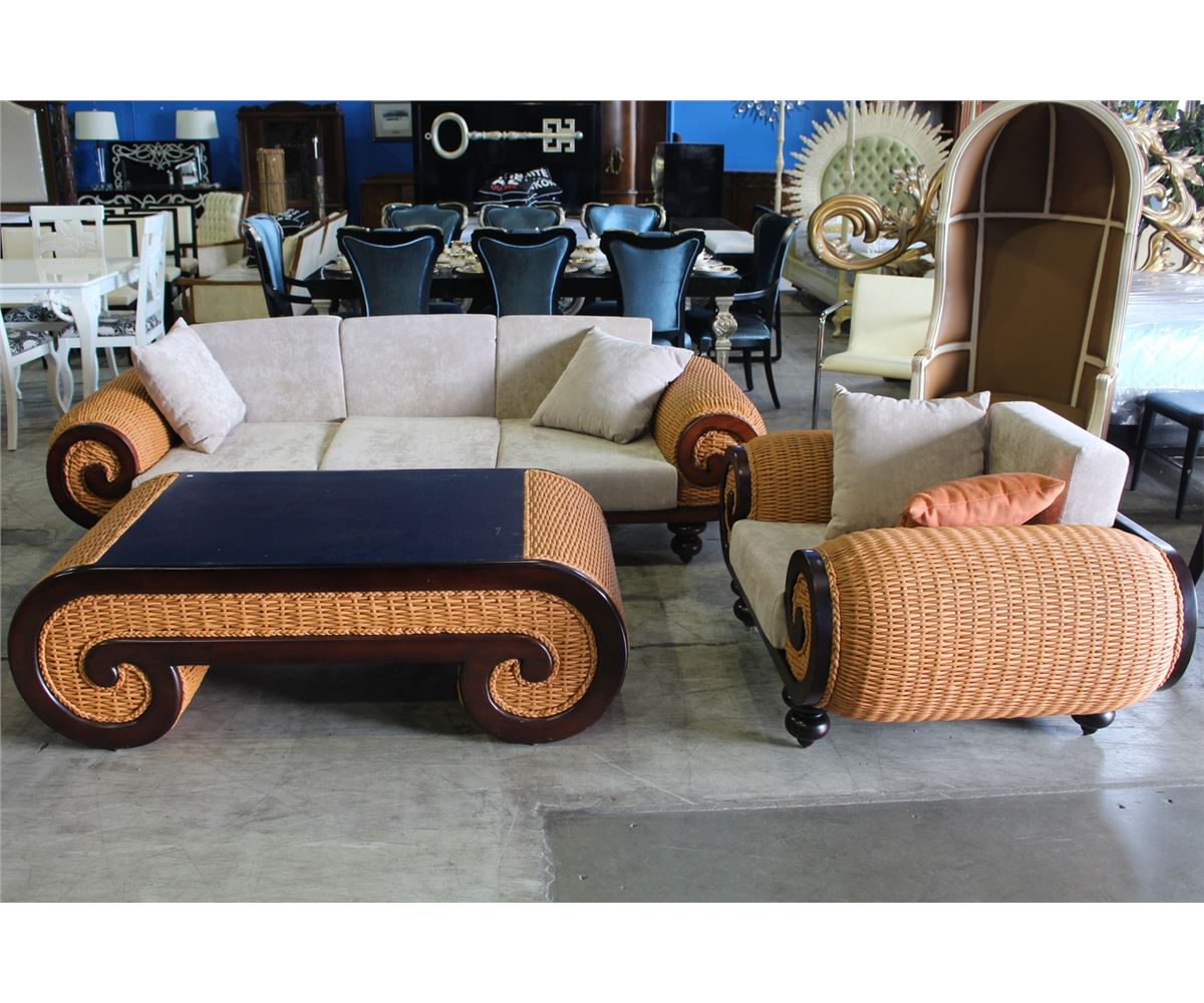 3PC TANGERINE DREAM COLLECTION SOFA SET; SOFA, CHAIR AND COFFEE TABLE. FEATURES VINYL LEATHER WOVEN ARMS, BEIGE UPHOLSTERED SEATS AND MAHOGANY FRAME