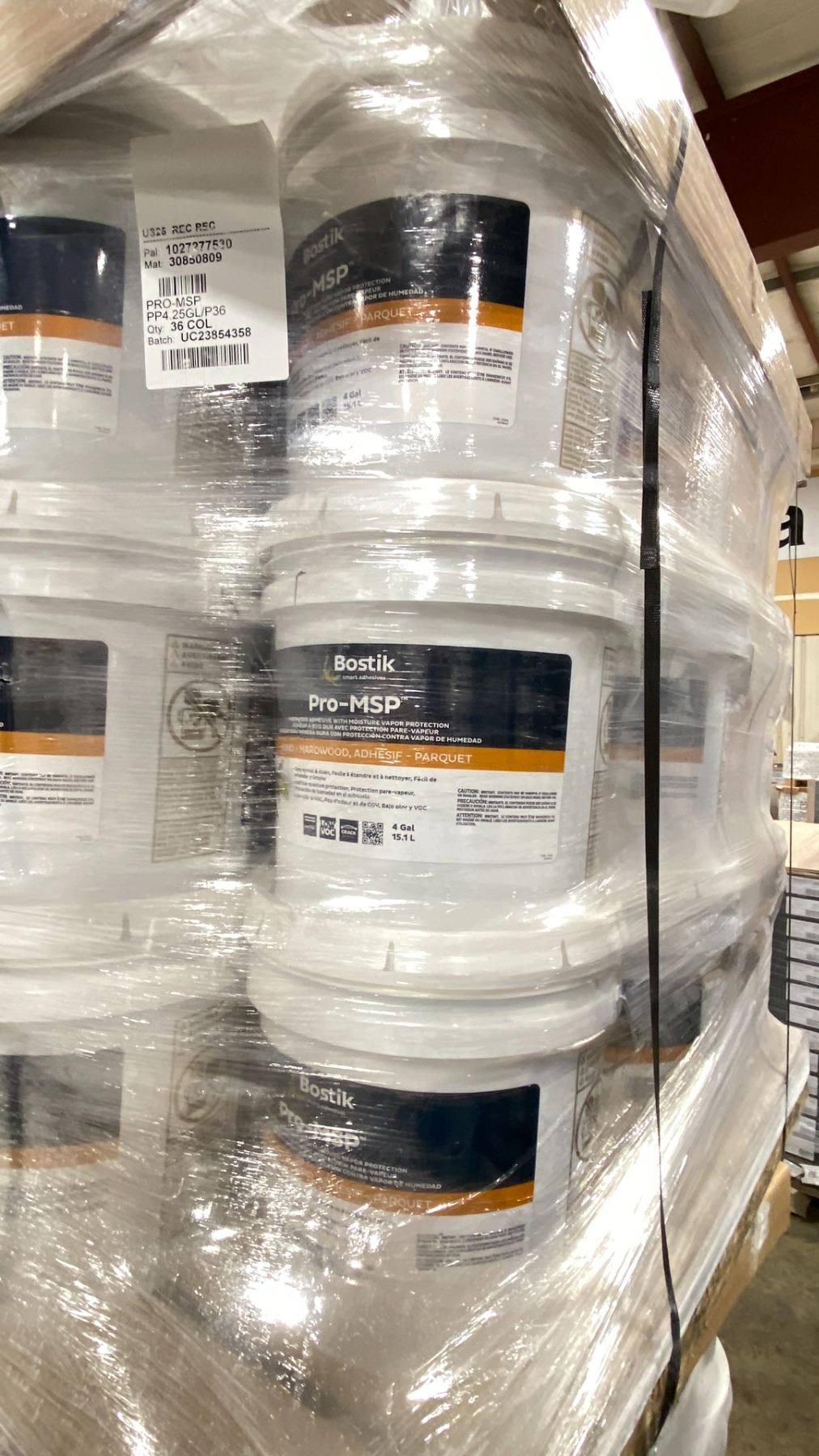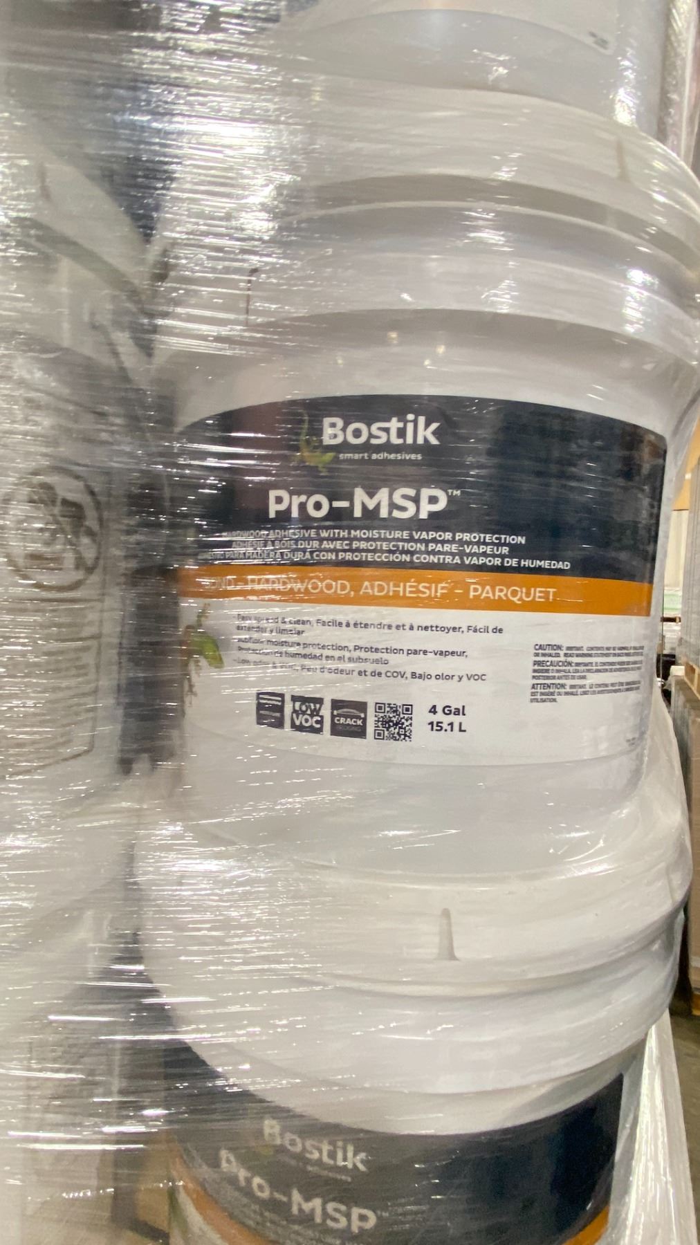 3X 4 GALLON PALES OF BOSTIK PRO-MSP COMMERCIAL HARDWOOD ADHESIVE