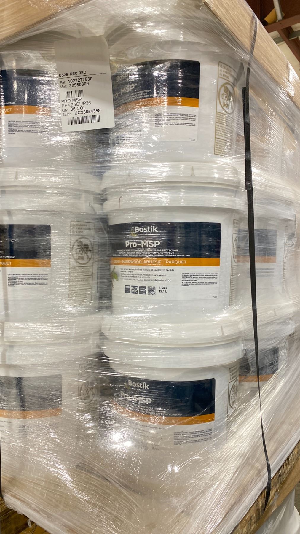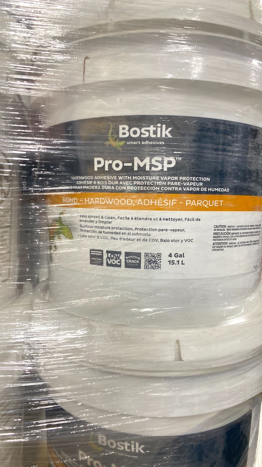 3X 4 GALLON PALES OF BOSTIK PRO-MSP COMMERCIAL HARDWOOD ADHESIVE
