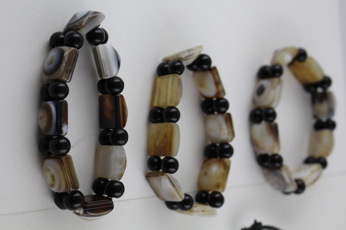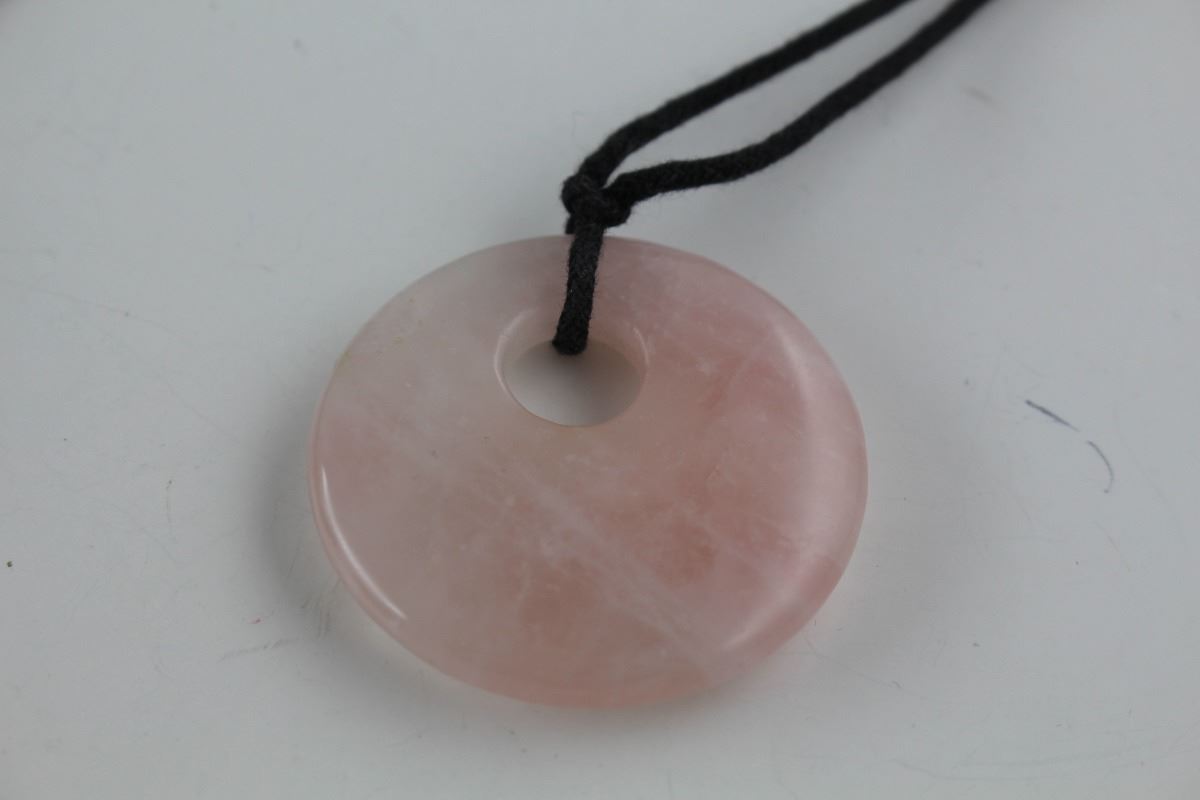 3X BLACK BEAD AND SQUARE STONE BRACELET, POLISHED ROSE QUARTZ PENDANT (ON BLACK CORD)