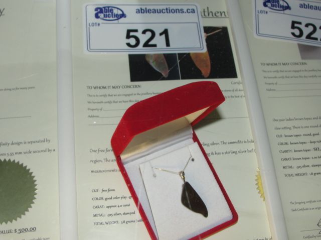 4.00CARAT AMMOLITE PENDANT. GREEN ORANGE AND RED COLOR PLAY. INCLUDES $300 CERTIFICATE