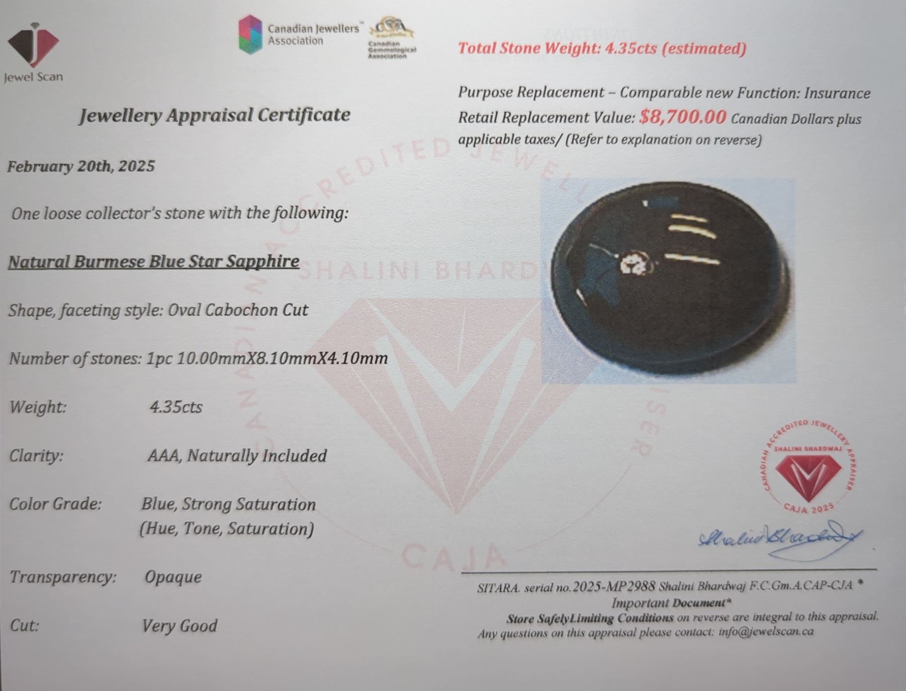 4.35 CT CERTIFIED BLUE STAR SAPPHIRE GEMSTONE ($8,700 APPRAISAL) - **APPRAISAL NOT GUARANTEED**