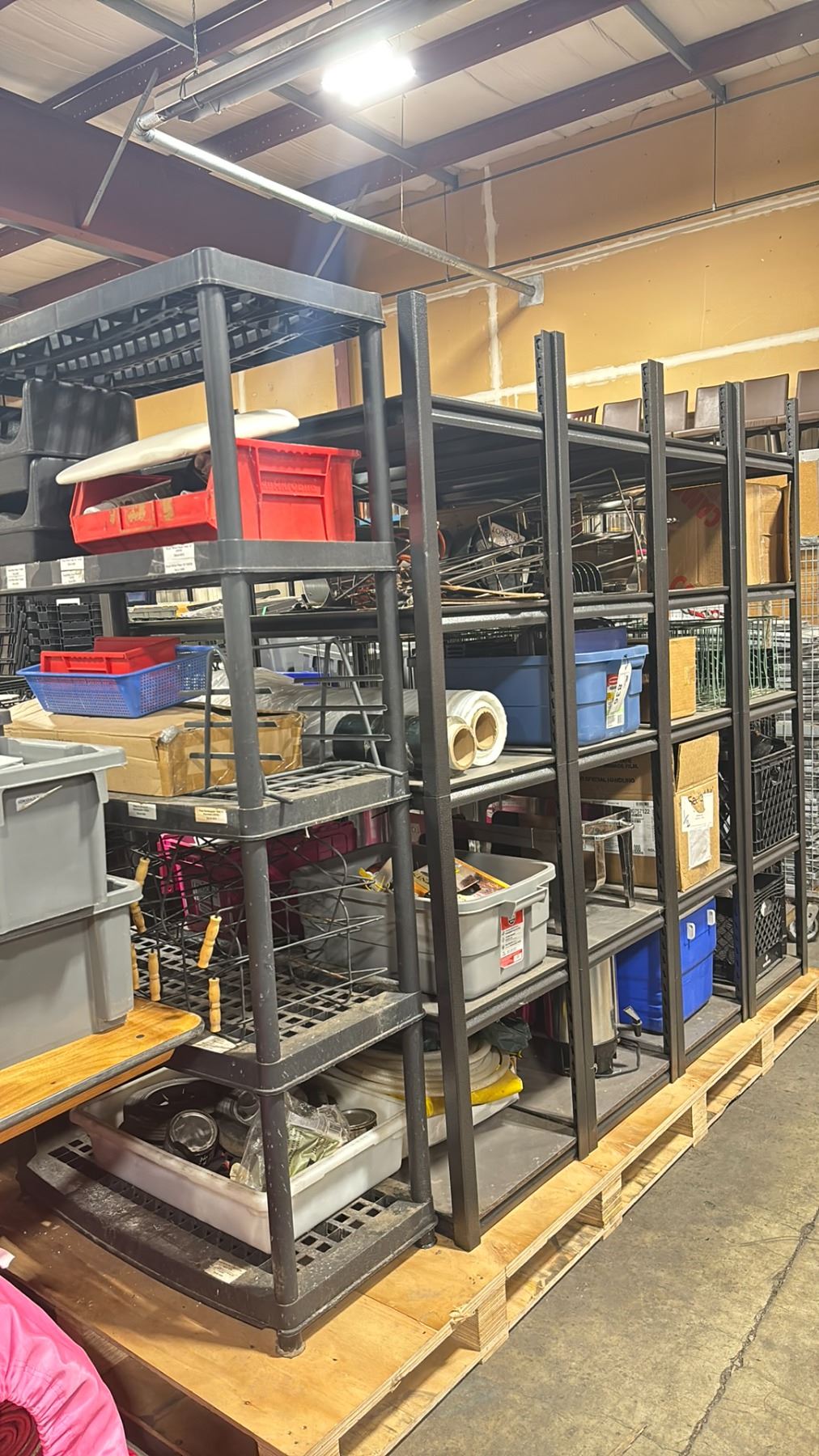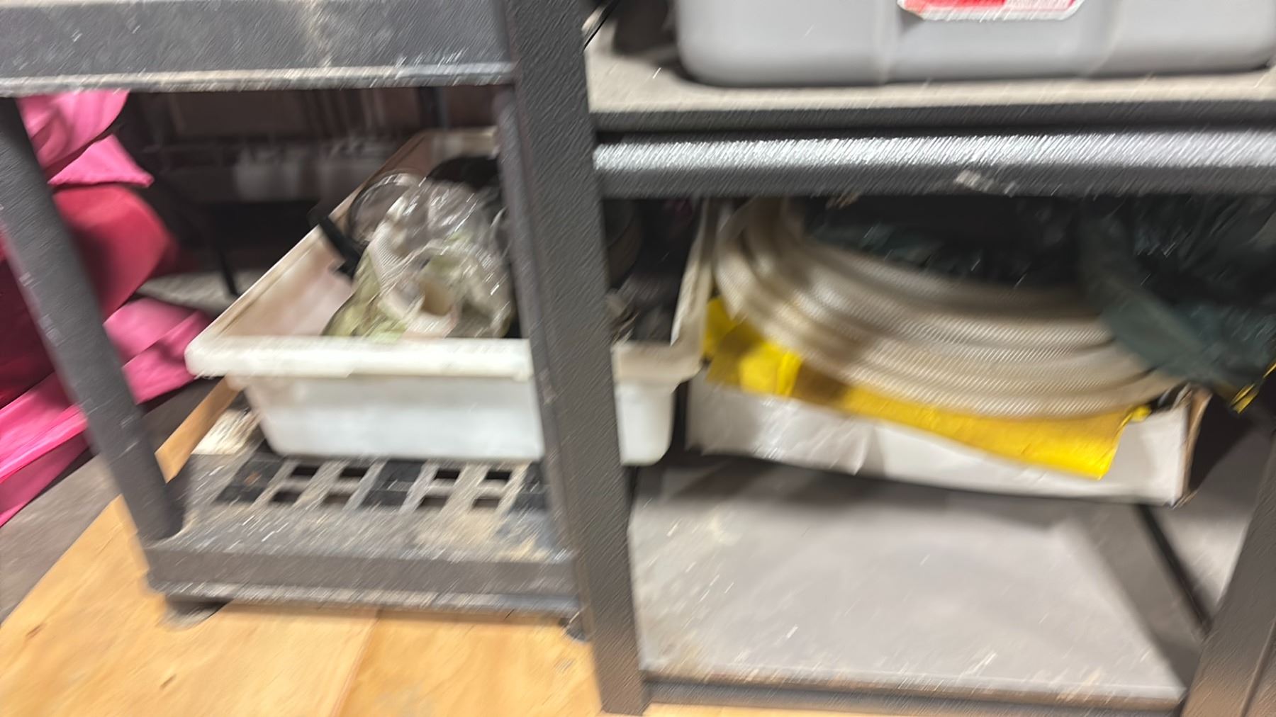 4 ADJUSTABLE METAL / WOOD STORAGE SHELVING UNITS, PLASTIC STORAGE SHELF & ASSORTED EVENT REPAIR ITEMS / SHELVING CONTENTS *SHELVING INCLUDED*