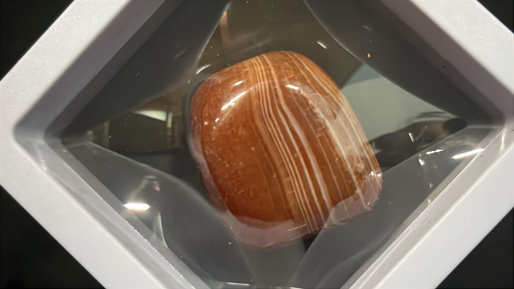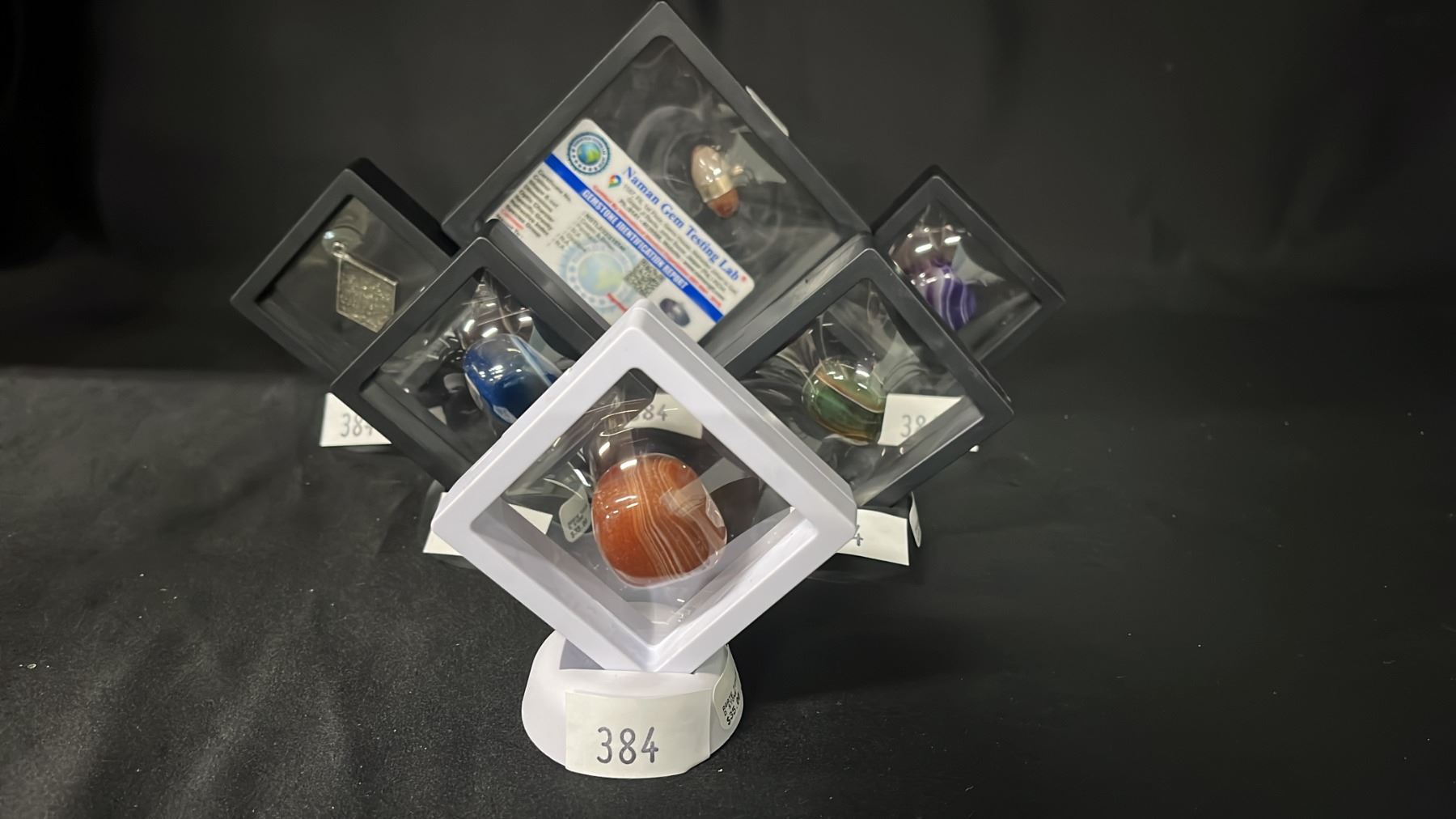 4 AGATE TUMBLED STONES, PYRITE PENDANT & OPAQUE PENDANT