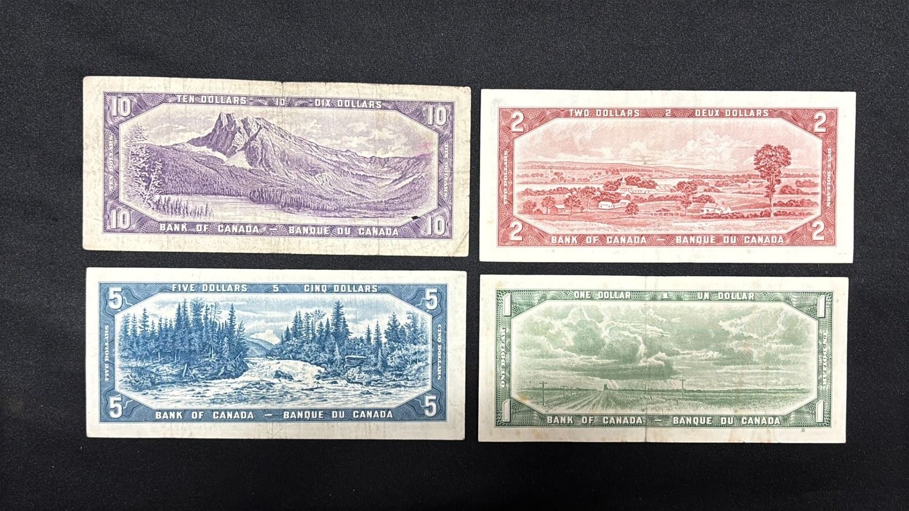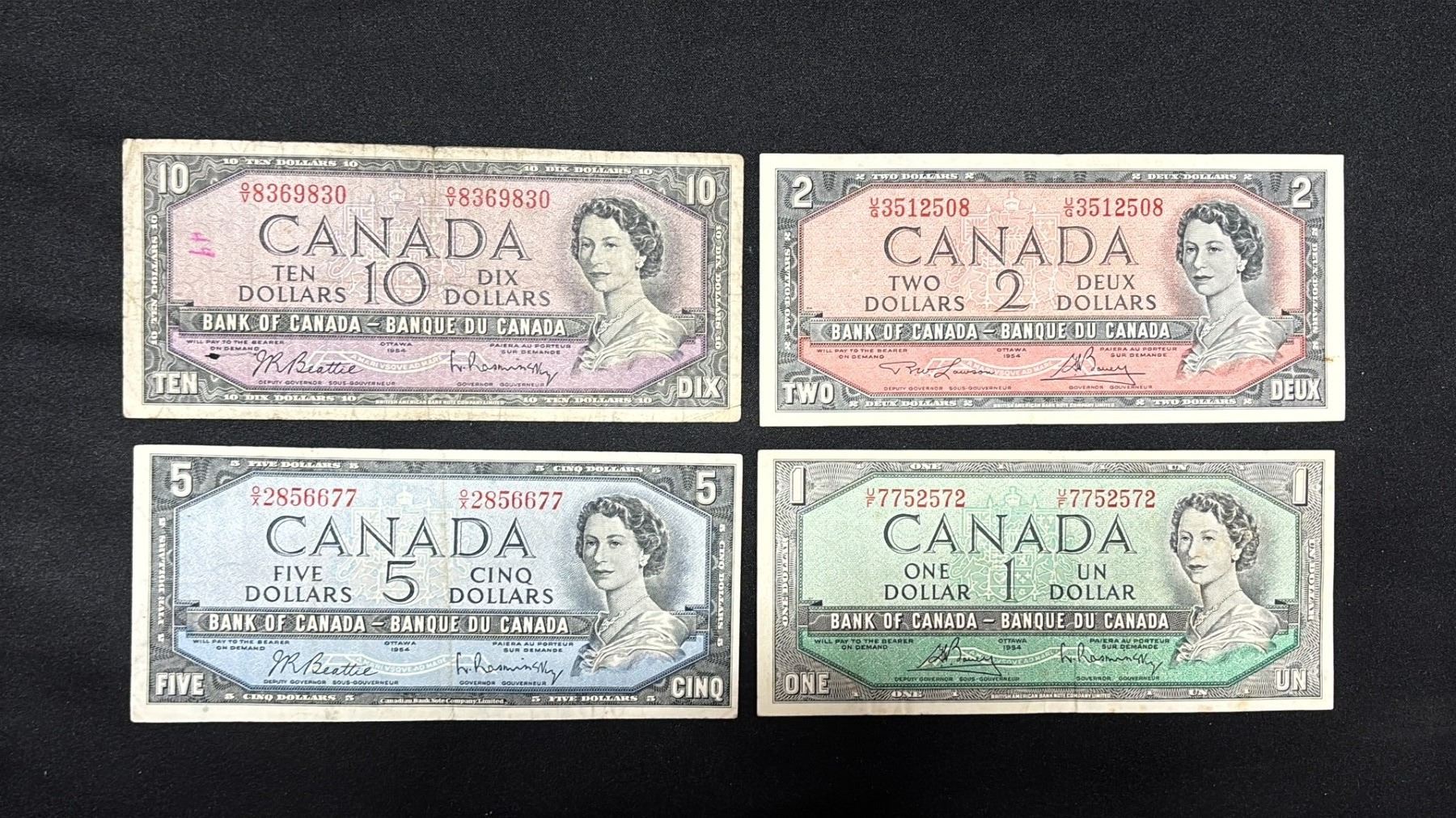 (4) ASSORTED 1954 CANADIAN BANK NOTES INCLUDING; (1 OF EACH) $10, $5, $2, $1