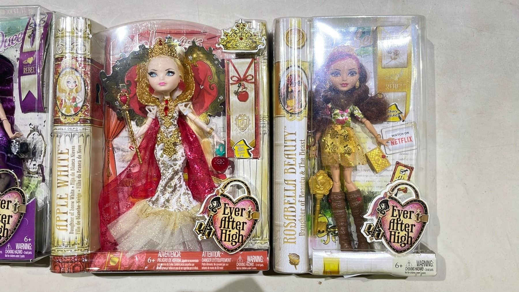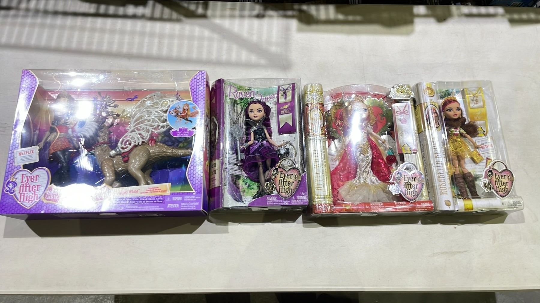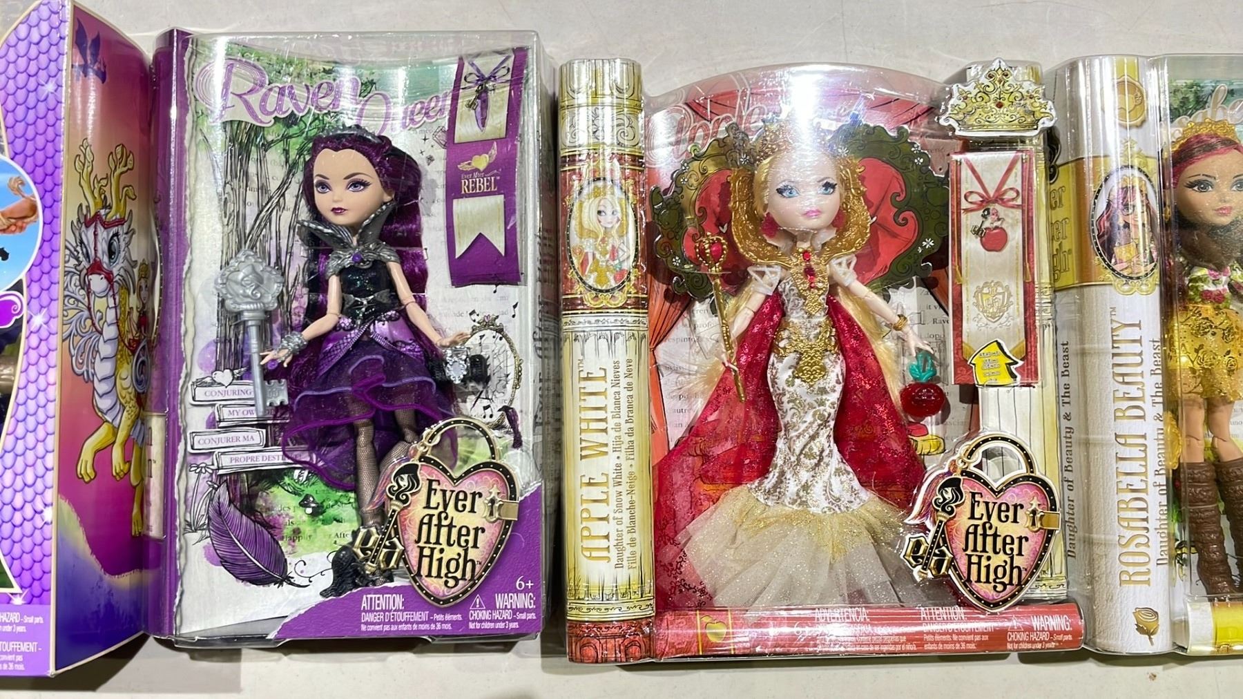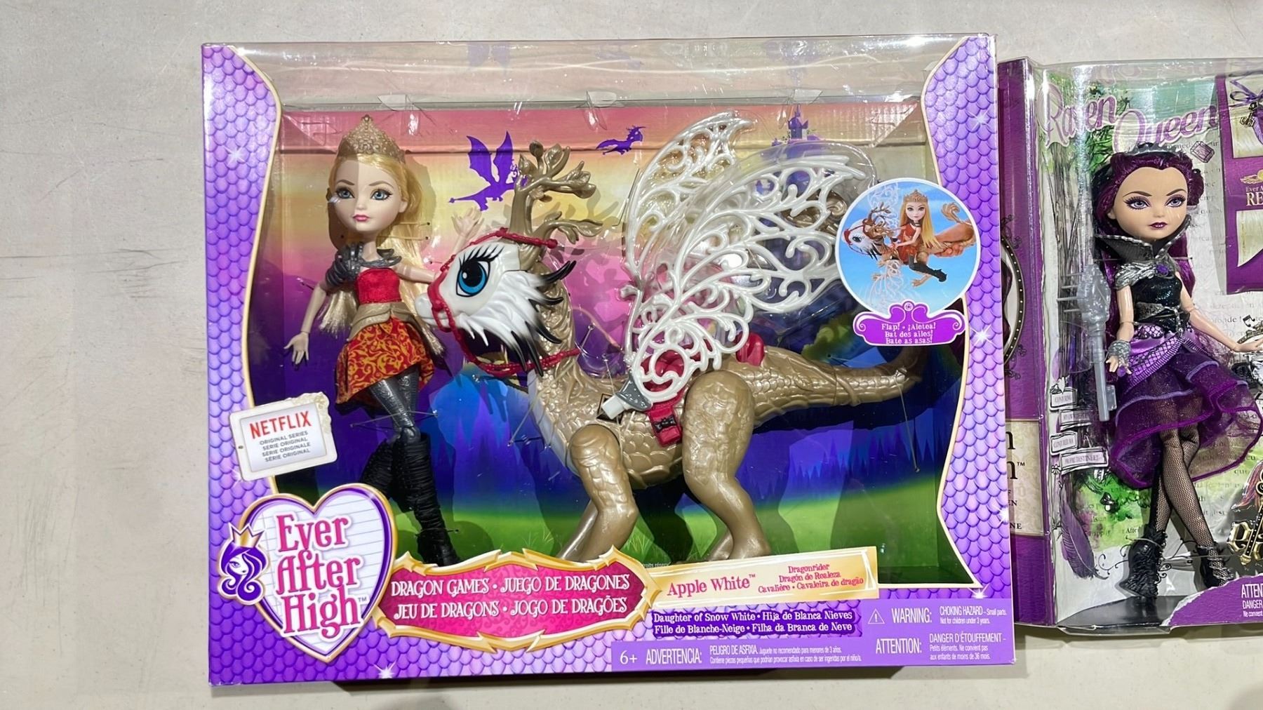 4 ASSORTED EVER AFTER HIGH DOLLS INCLUDING; ROSABELLA BEAUTY, APPLE WHITE, RAVEN QUEEN & DRAGON GAMES APPLE WHITE