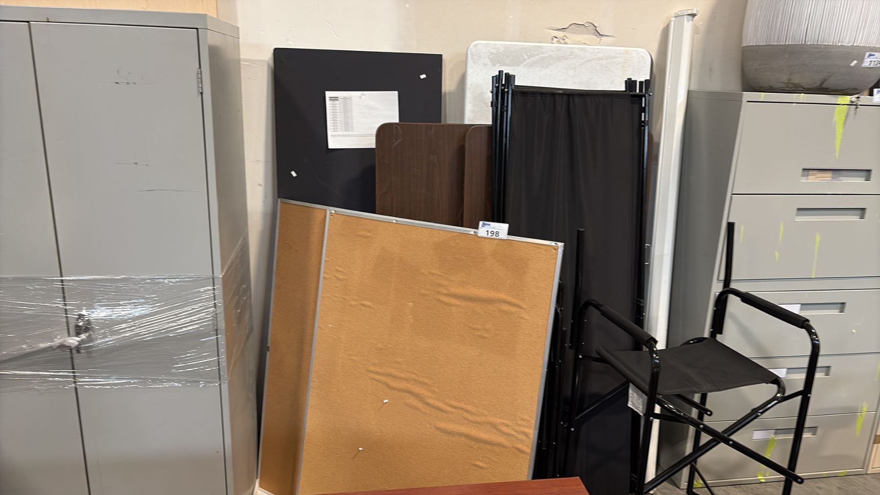 4 ASSORTED FOLDING TABLES, 2 SMALL TACKBOARDS, 6' PULL DOWN SCREEN AND MORE