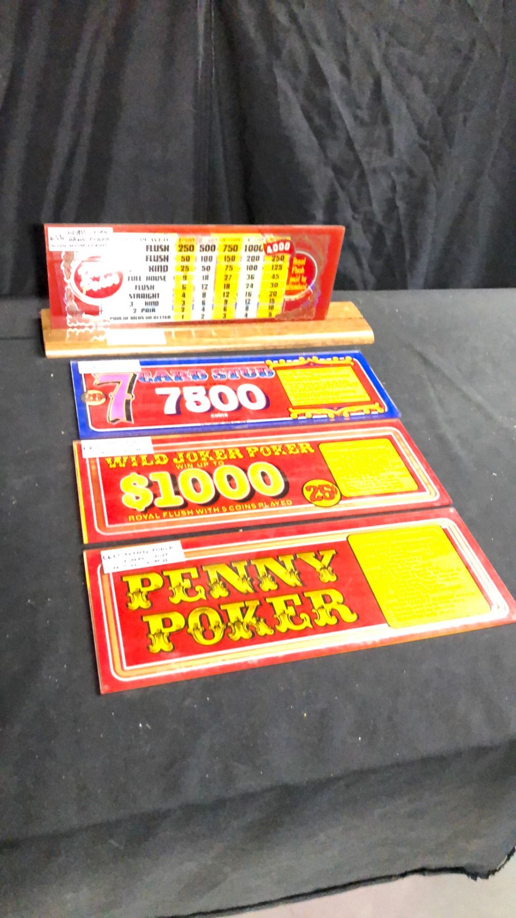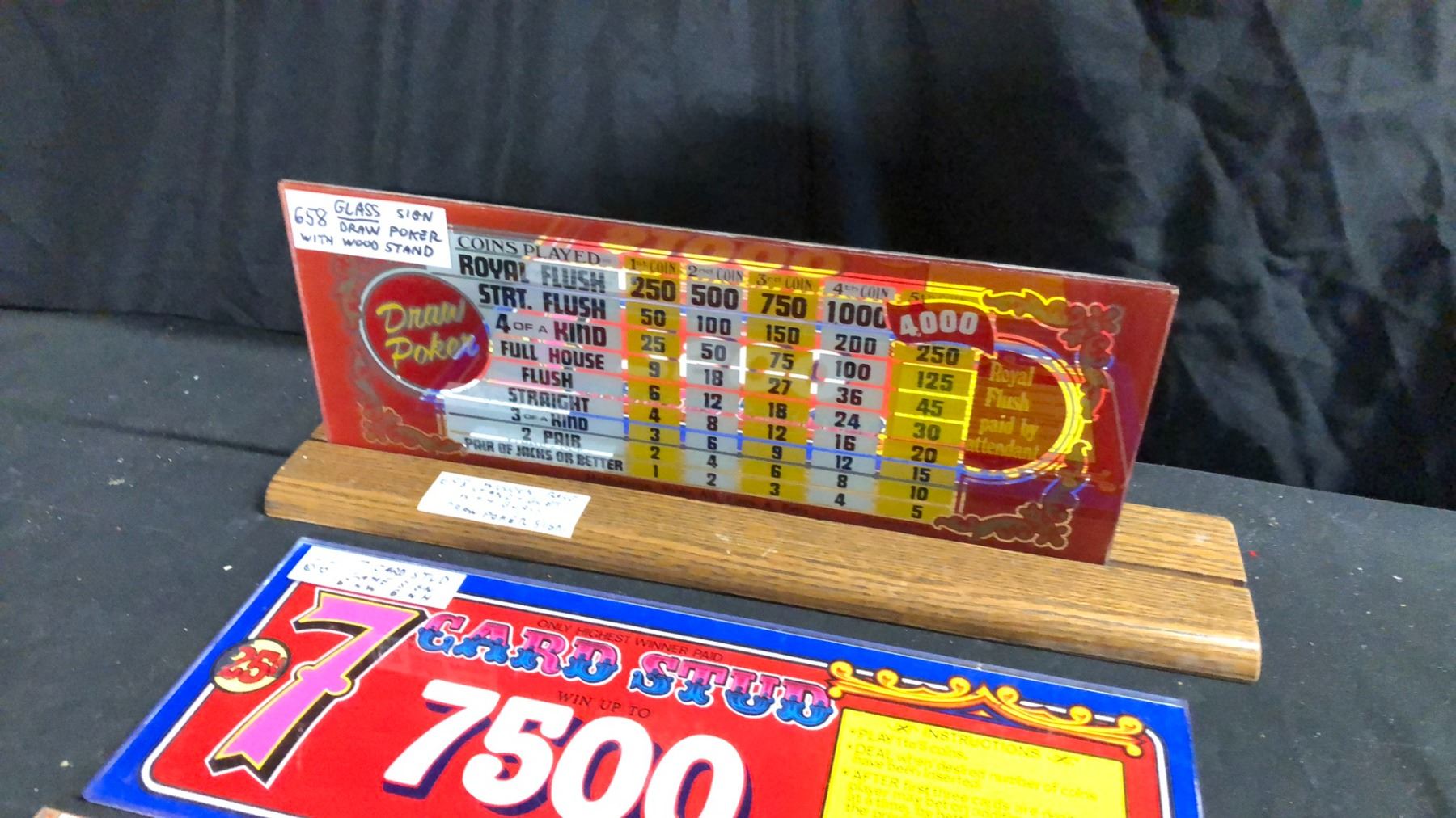 4 ASSORTED GLASS GAME SIGNS WITH WOODEN HOLDER