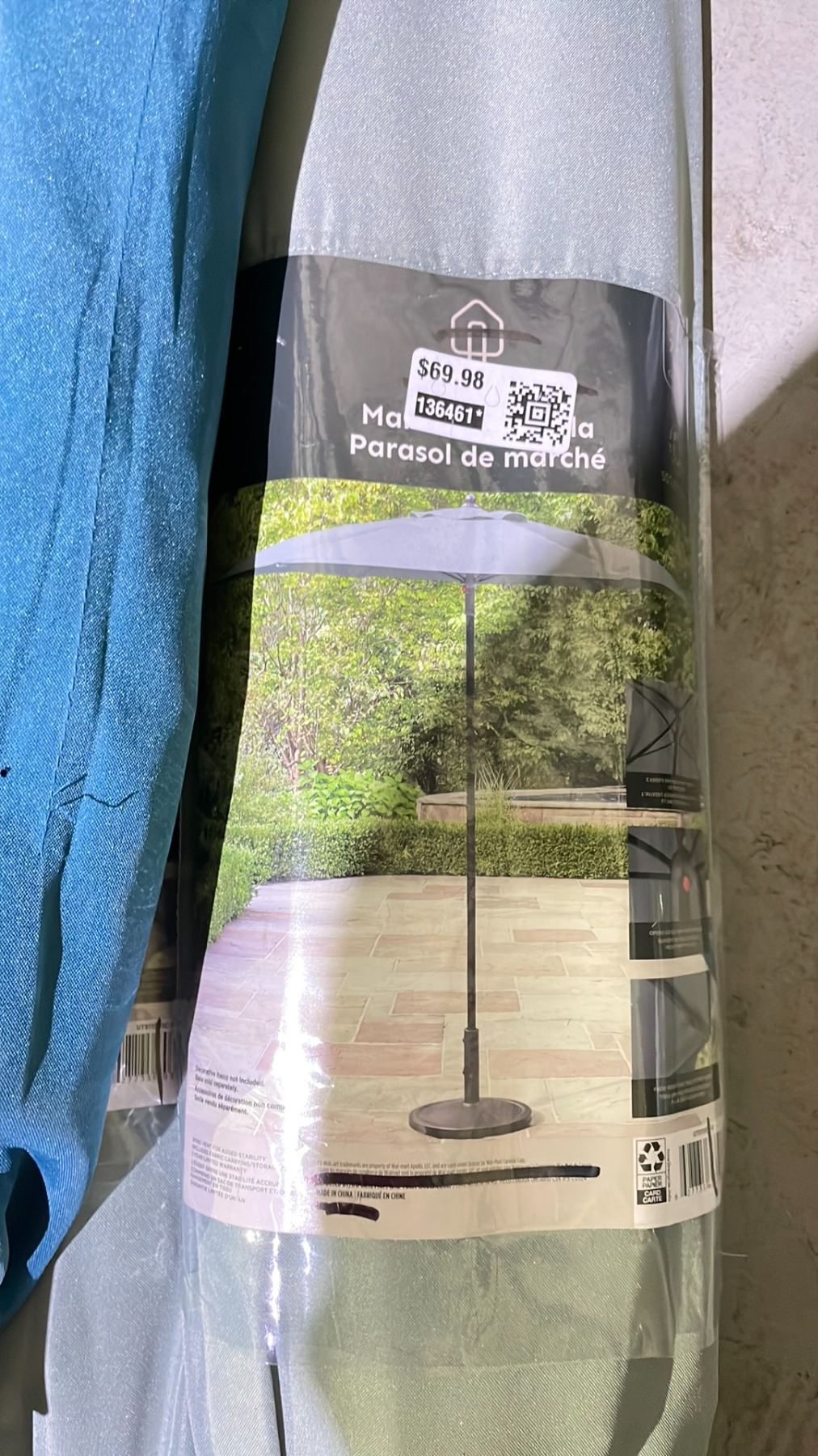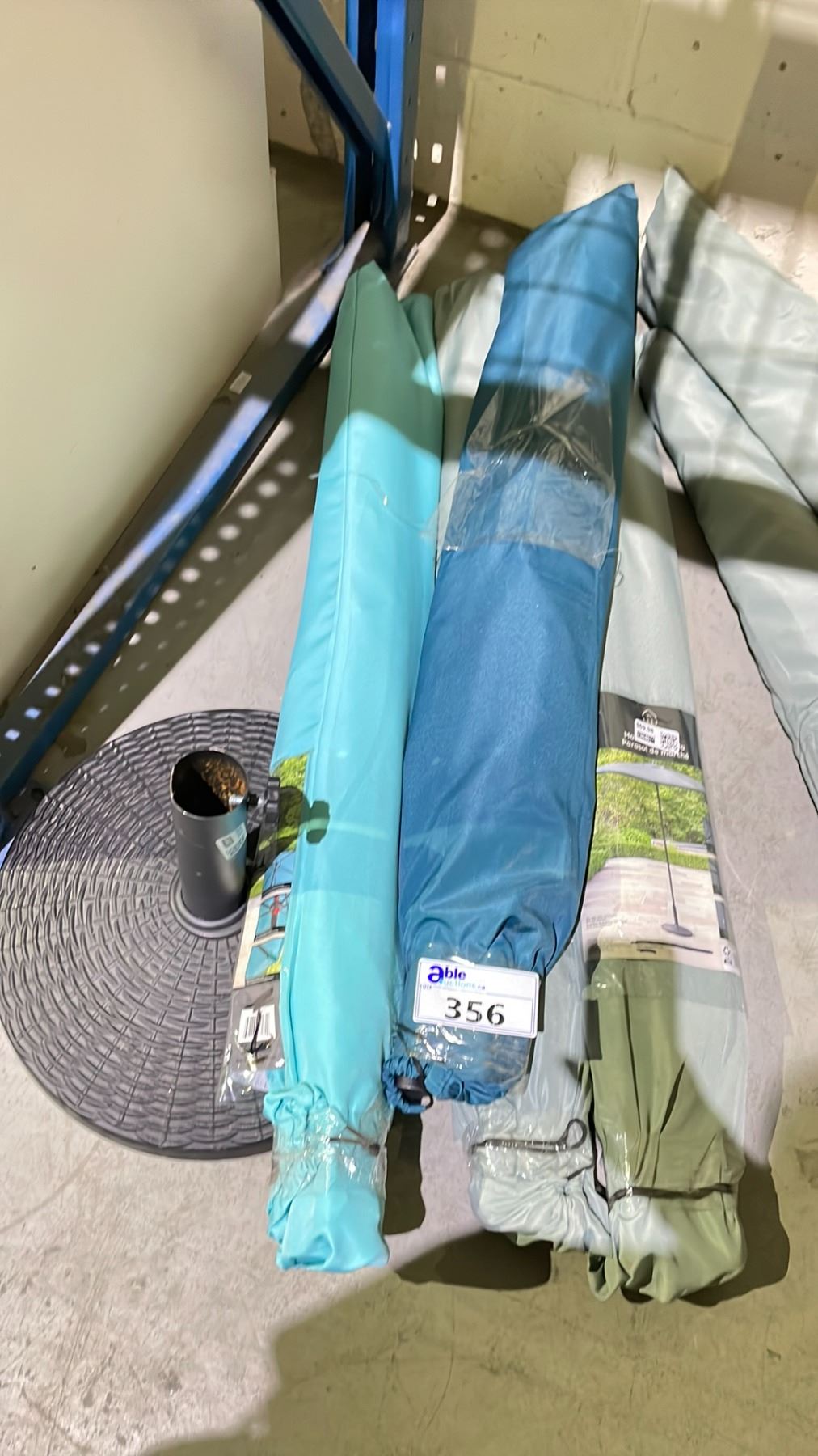 4 ASSORTED MARKET/PATIO UMBRELLAS WITH 1 BASE