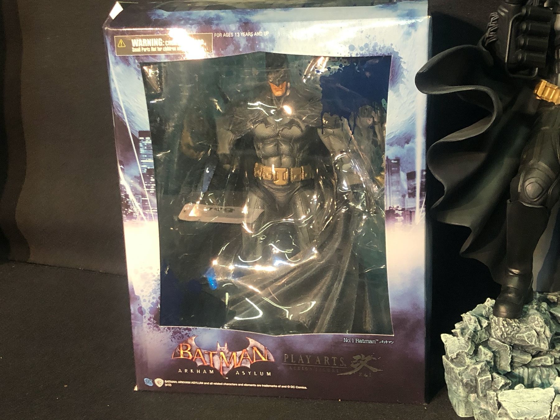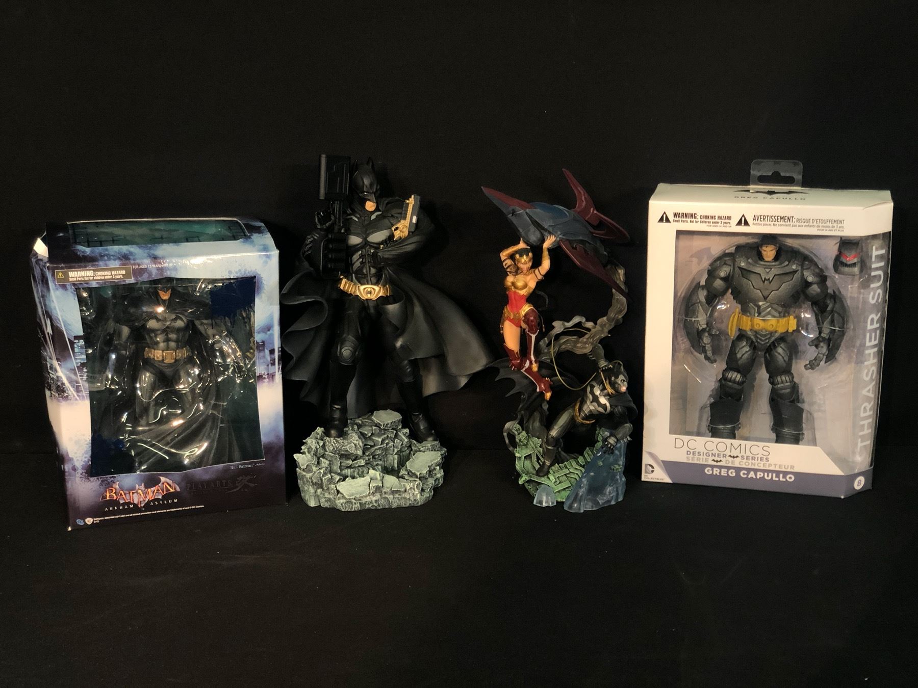 4 BATMAN STATUES/FIGURINES INC. GREG CAPULLO DESIGNER SERIES STATUE IN BOX, ARKHAM ASYLUM NO. 1 BATMAN STATUES IN BOX, AND 2 OTHERS