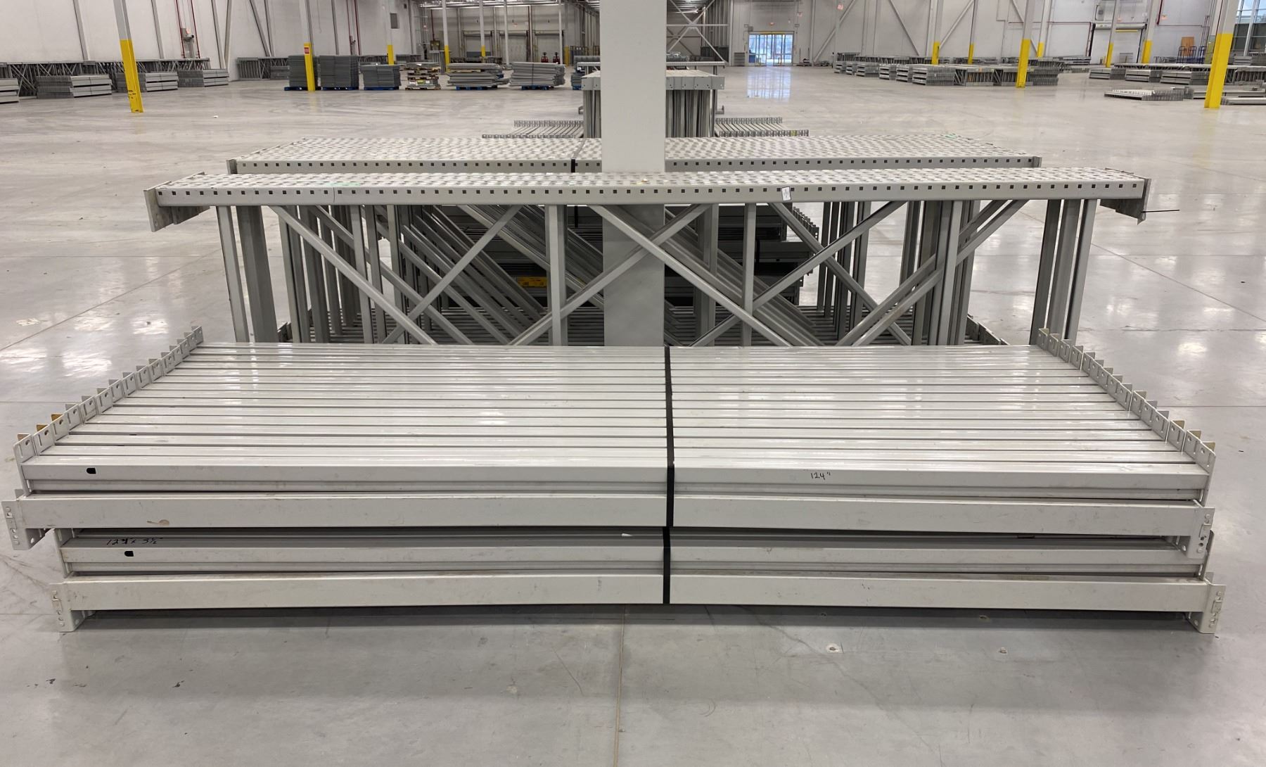 4 BAYS GREY INDUSTRIAL PALLET RACKING (5) UPRIGHTS 144" X 42" AND (60) SIDE BEAMS 124" X 3.5" WITH 8" X 6" WELDED FOOTPLATES 1/2" THICK