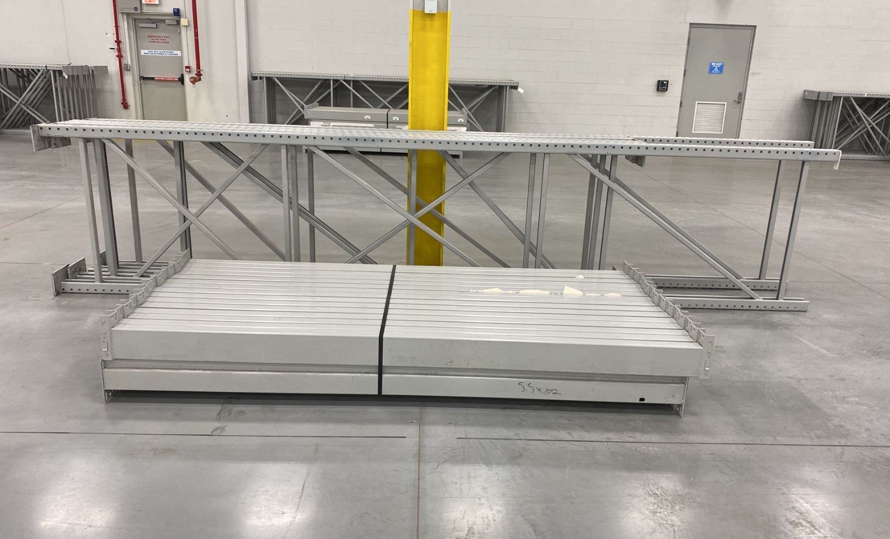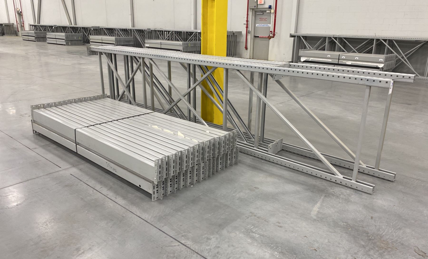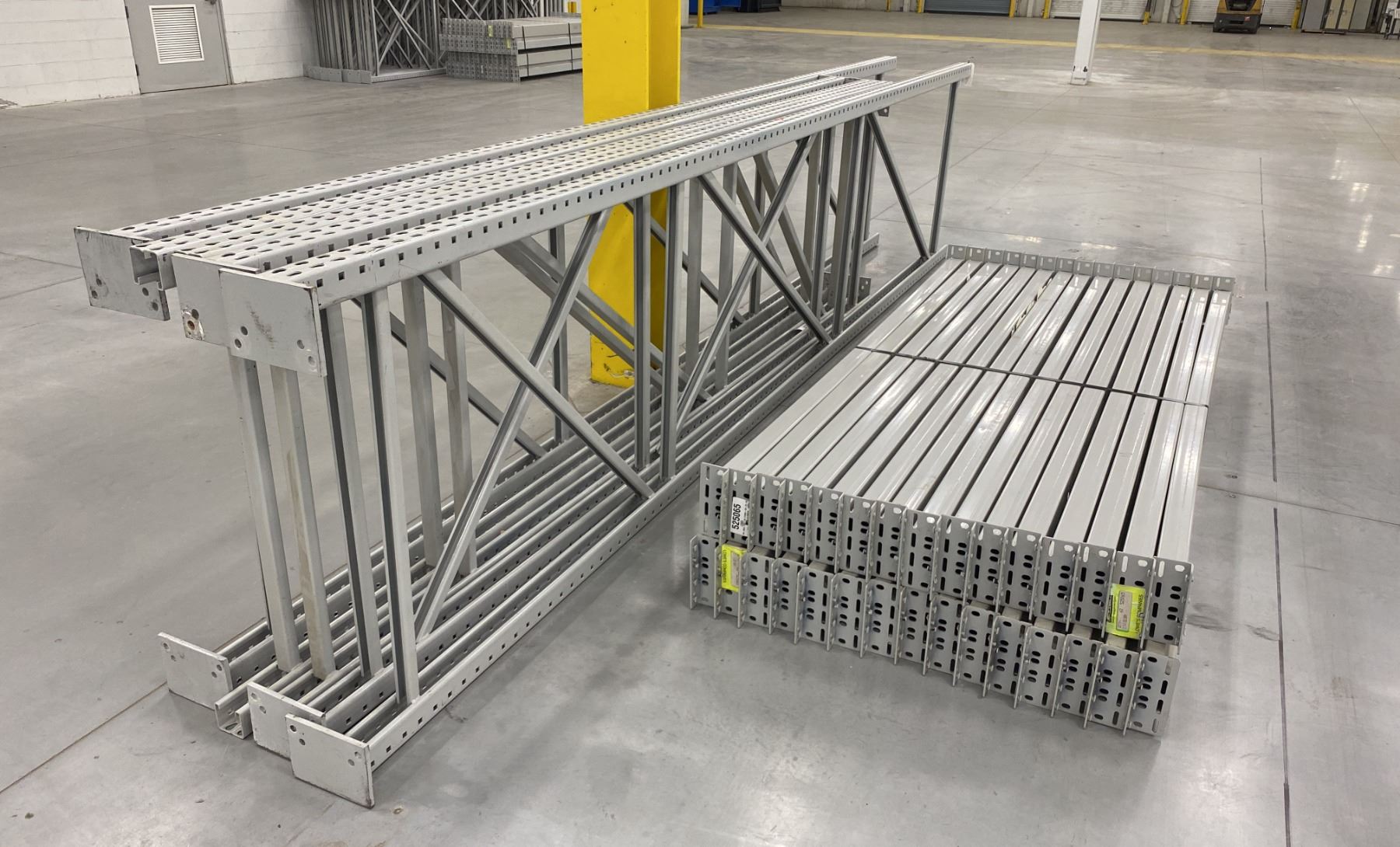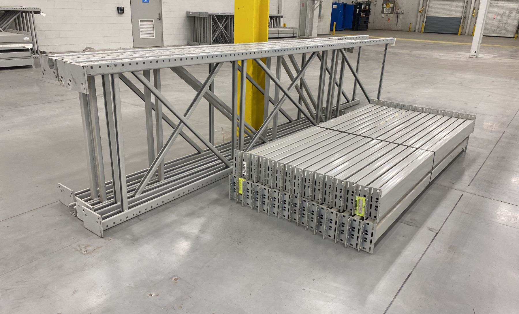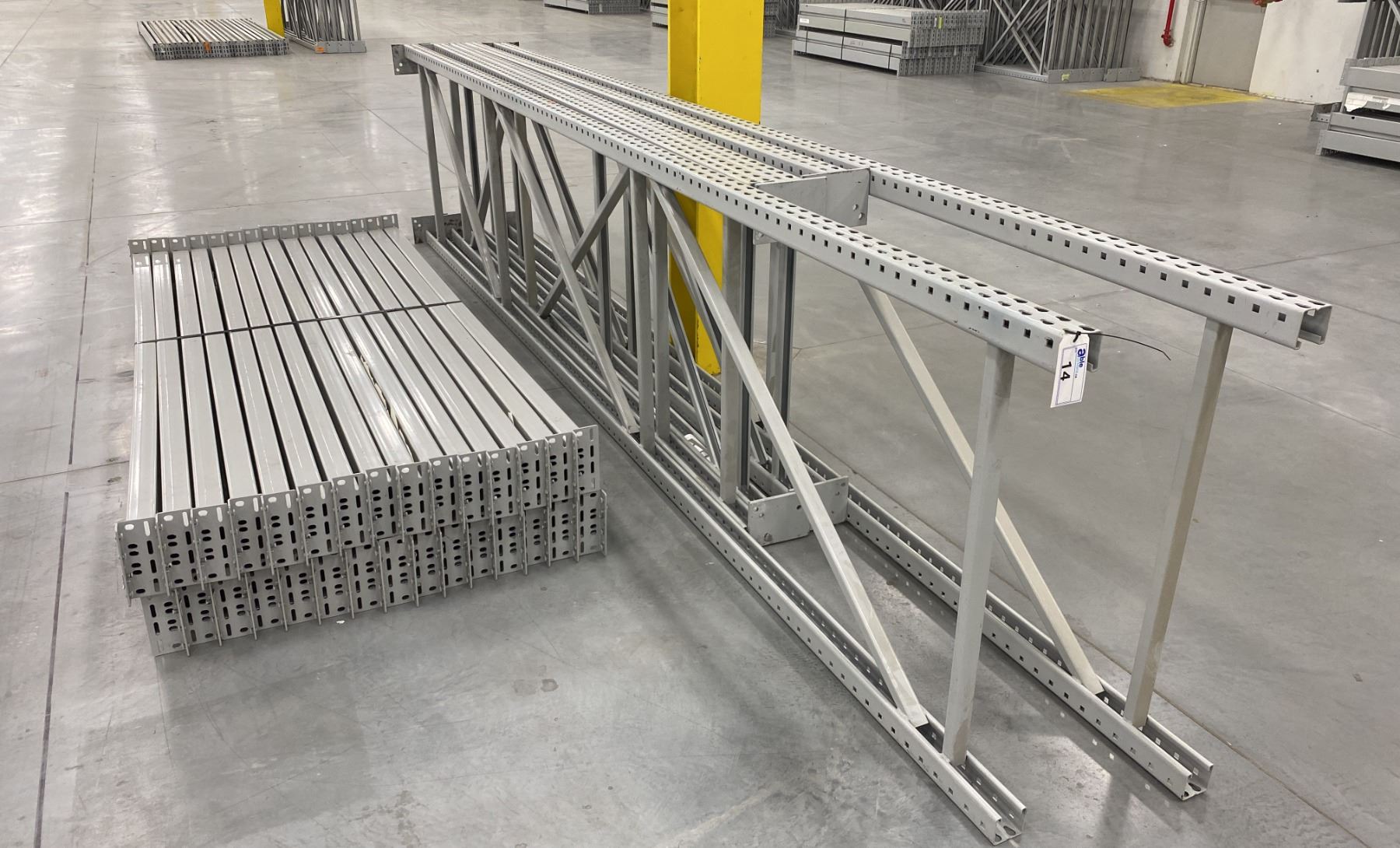 4 BAYS GREY INDUSTRIAL PALLET RACKING (5) UPRIGHTS (2) 16FT/ (3) 12FT X 3.5FT AND (30) SIDE BEAMS 102" X 5.5", WITH 8" X 6" WELDED FOOTPLATES 1/2" THICK