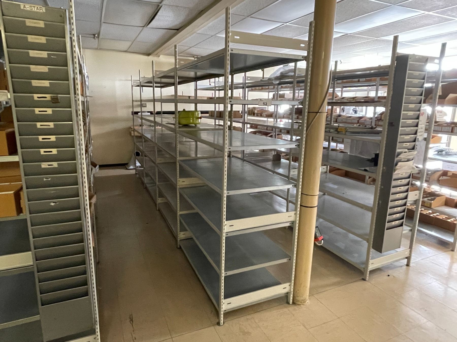 4 BAYS OF EZ-RECT STYLE PARTS SHELVING 84"H X 48"W X 24"D ( HELICOPTER PARTS NOT INCLUDED )