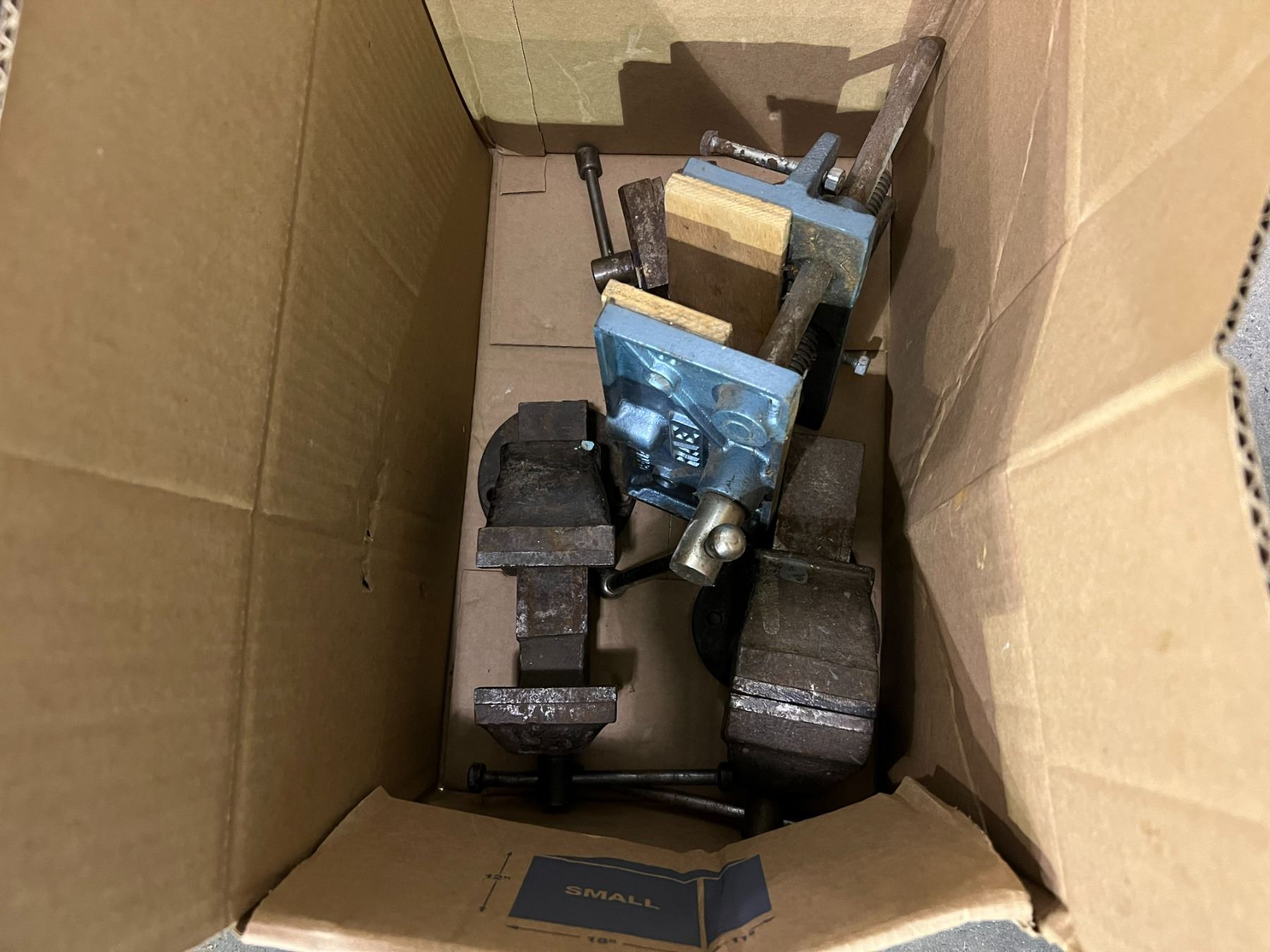 4 BENCH VISES (1 X 8" WOOD VISE & 3 X 3" METAL WORK VISES)