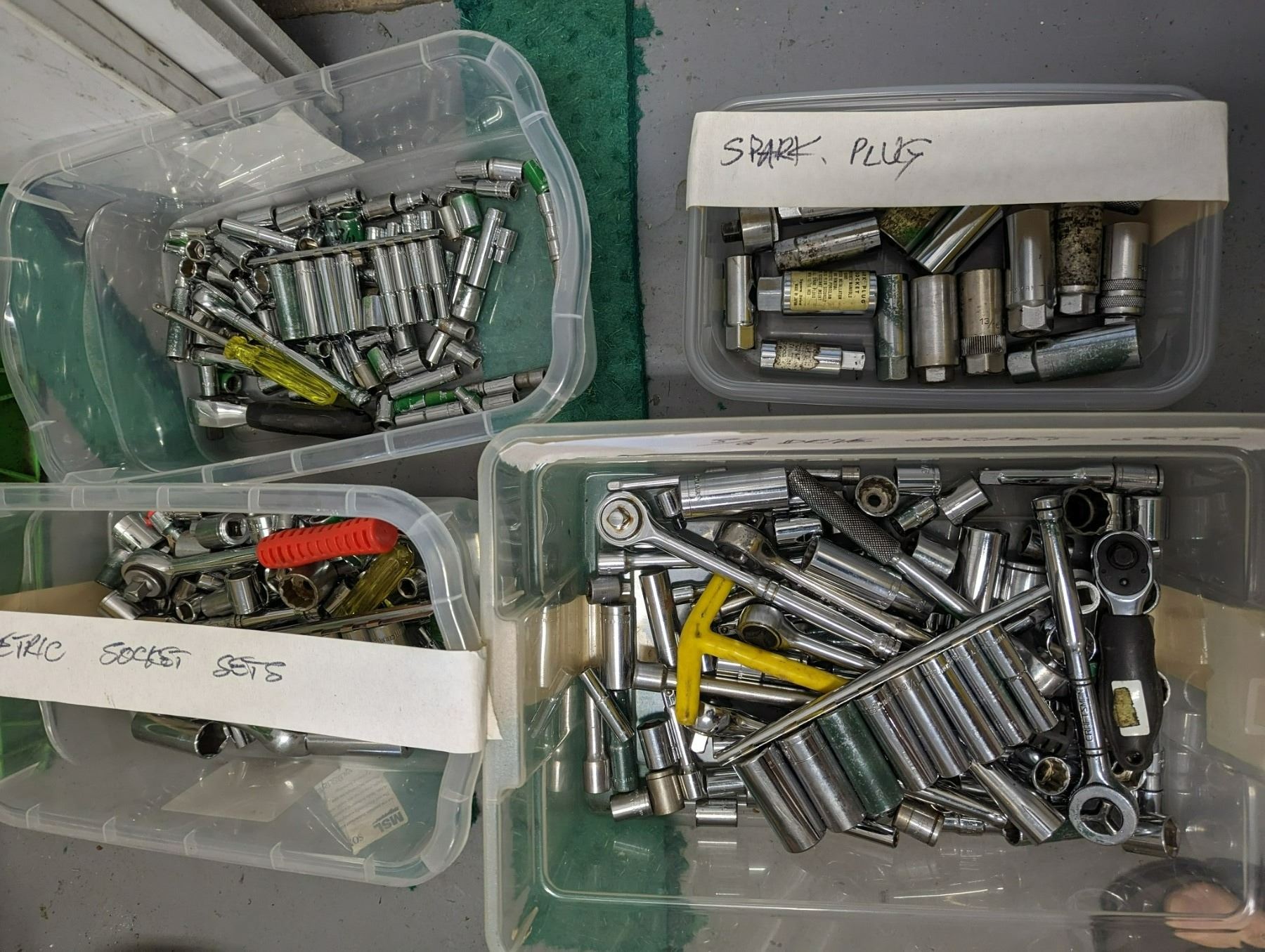 4 BINS OF ASSORTED SOCKETS. 1/4" & 3/8". METRIC AND STANDARD. APPROX. 10 RACHETS