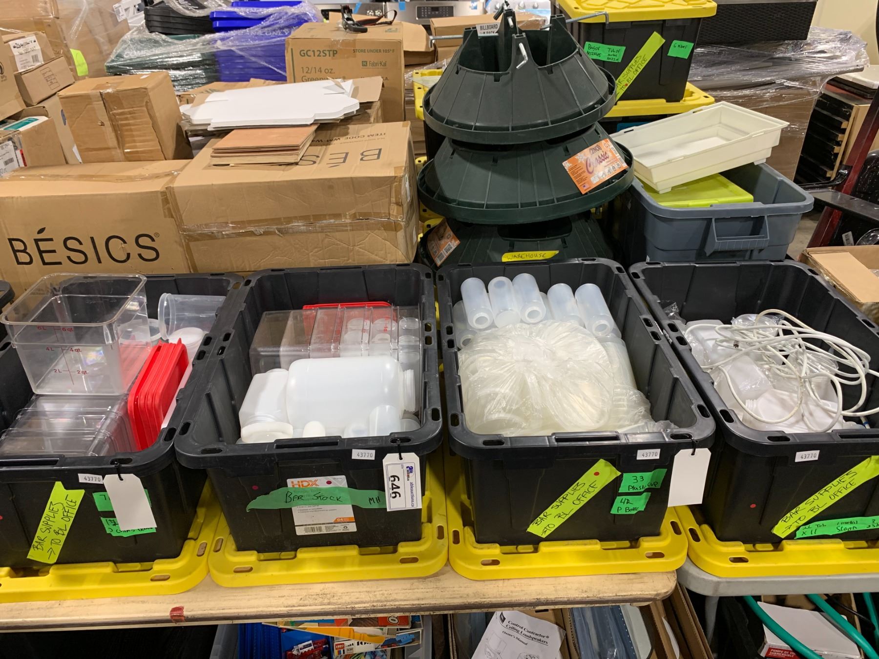 4 BLACK PLASTIC BIN OF ASSORTED BAR SUPPLIES ( BIN INCLUDED )