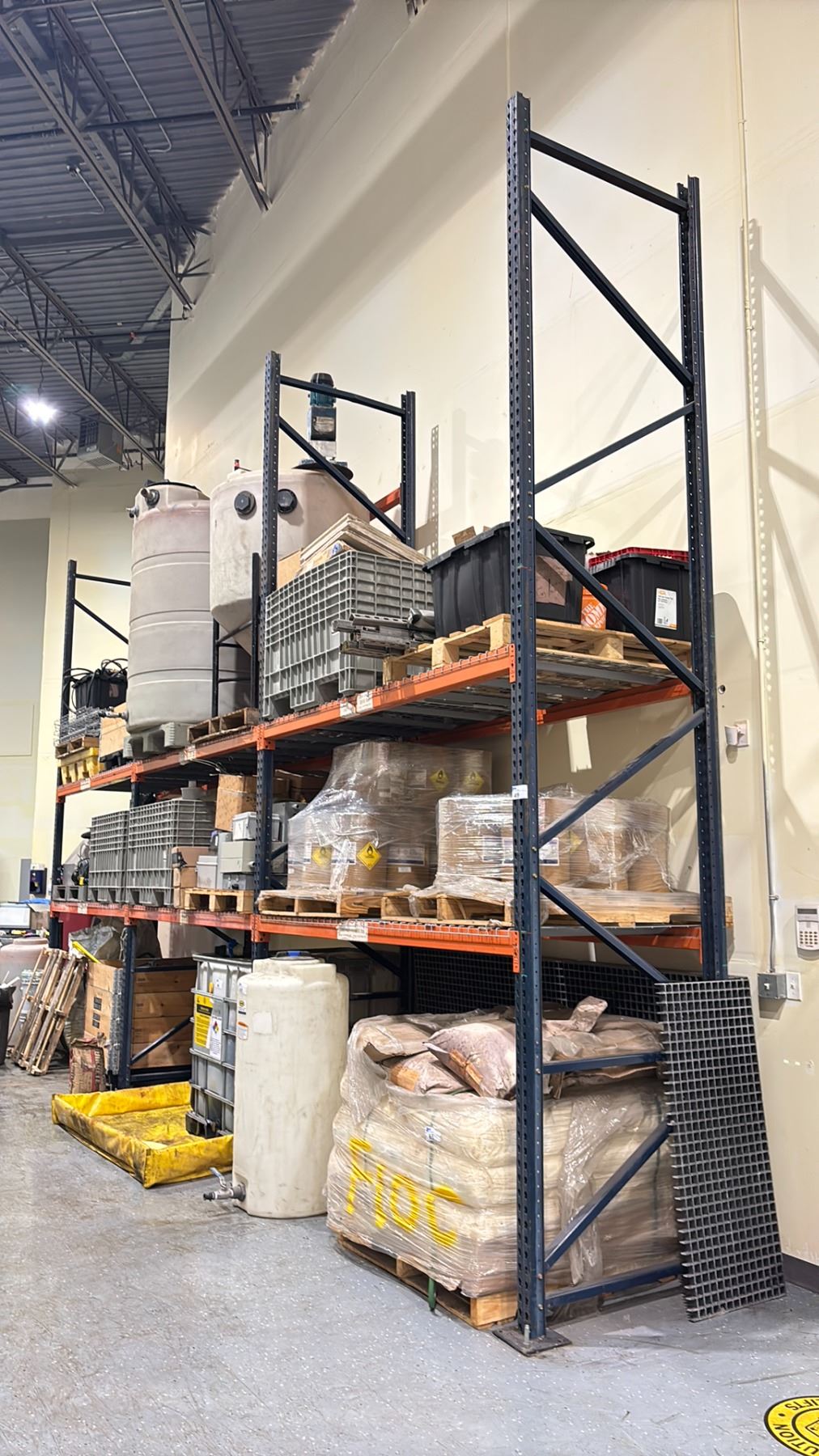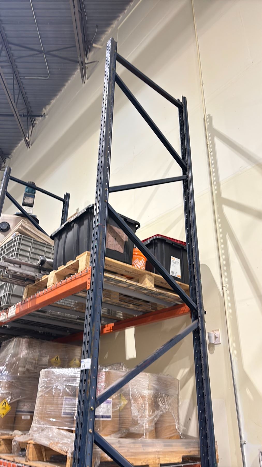 4 BLUE PALLET RACKING UPRIGHTS & 17 ORANGE CROSSBARS WITH MESH DECKING APPROX. 300"W X 42"D X 16'H *LAST DAY REMOVAL/CONTENTS NOT INCLUDED*